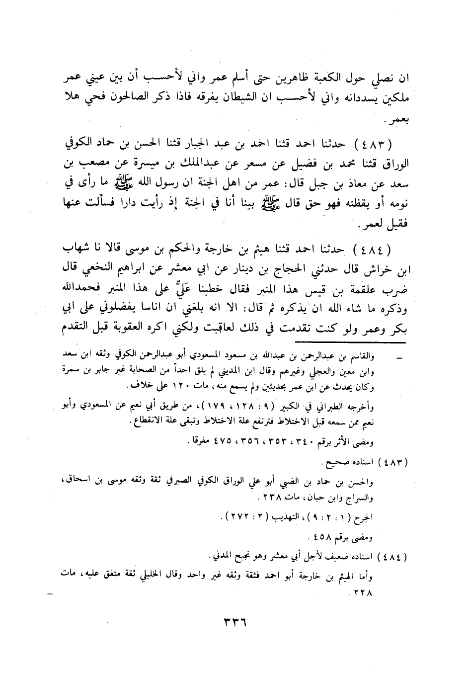 484 - حَدَّثَنَا أَحْمَدُ قثنا هَيْثَمُ بْنُ خَارِجَةَ، وَالْحَكَمُ بْنُ مُوسَى، قَالَا: نا شِهَابُ بْنُ خِرَاشٍ قَالَ: حَدَّثَنِي الْحَجَّاجُ بْنُ دِينَارٍ، عَنْ أَبِي مَعْشَرٍ، عَنْ إِبْرَاهِيمَ النَّخَعِيِّ قَالَ: ضَرَبَ عَلْقَمَةُ بْنُ قَيْسٍ هَذَا الْمِنْبَرَ فَقَالَ: خَطَبَنَا عَلِيٌّ عَلَى هَذَا الْمِنْبَرِ، فَحَمِدَ اللَّهَ وَذَكَرَهُ مَا شَاءَ اللَّهُ أَنْ يَذْكُرَهُ، ثُمَّ قَالَ: أَلَا إِنَّهُ بَلَغَنِي أَنَّ أُنَاسًا يُفَضِّلُونِي عَلَى أَبِي بَكْرٍ وَعُمَرَ، وَلَوْ كُنْتُ تَقَدَّمْتُ فِي ذَلِكَ لَعَاقَبْتُ، وَلَكِنِّي أَكْرَهُ الْعُقُوبَةَ قَبْلَ التَّقَدُّمِ، فَمَنْ قَالَ شَيْئًا مِنْ ذَلِكَ فَهُوَ مُفْتَرٍ، عَلَيْهِ مَا عَلَى الْمُفْتَرِي، إِنَّ §خَيْرَ النَّاسِ بَعْدَ رَسُولِ اللَّهِ صَلَّى اللهُ عَلَيْهِ وَسَلَّمَ أَبُو بَكْرٍ، ثُمَّ عُمَرُ، وَإِنَّا أَحْدَثْنَا بَعْدَهُمْ أَحْدَاثًا يَقْضِي اللَّهُ فِيهَا مَا أَحَبَّ، ثُمَّ قَالَ: أَحْبِبْ حَبِيبَكَ هَوْنًا مَا عَسَى أَنْ يَكُونَ بَغِيضَكَ يَوْمًا مَا، وَأَبْغِضْ بَغِيضَكَ هَوْنًا مَا عَسَى أَنْ يَكُونَ حَبِيبَكَ يَوْمًا مَا.