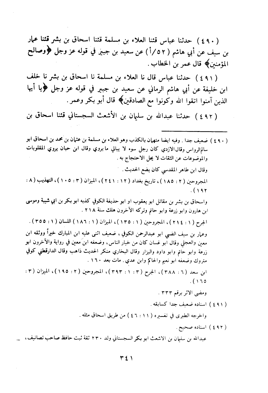 491 - حَدَّثَنَا عَبَّاسٌ قَالَ: نا الْعَلَاءُ بْنُ مَسْلَمَةَ، نا إِسْحَاقُ بْنُ بِشْرٍ، نا خَلَفُ بْنُ خَلِيفَةَ، عَنْ أَبِي هَاشِمٍ الرُّمَّانِيِّ، عَنْ سَعِيدِ بْنِ جُبَيْرٍ فِي قَوْلِهِ عَزَّ وَجَلَّ: {§يَا أَيُّهَا الَّذِينَ آمَنُوا اتَّقُوا اللَّهَ وَكُونُوا مَعَ الصَّادِقِينَ} [التوبة: 119] ، قَالَ: أَبُو بَكْرٍ وَعُمَرُ.