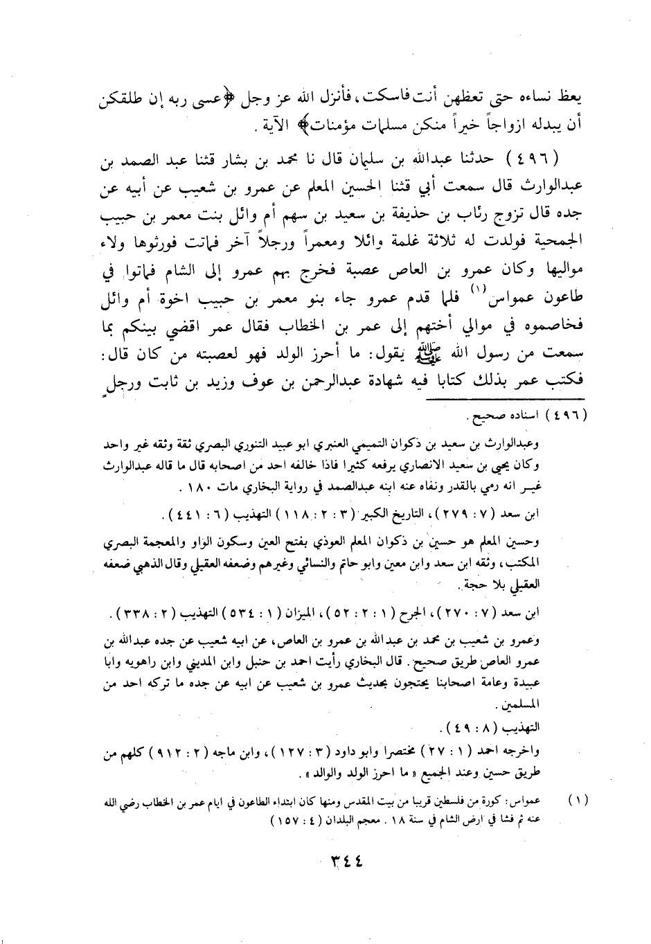 496 - حَدَّثَنَا عَبْدُ اللَّهِ بْنُ سُلَيْمَانَ قَالَ نا مُحَمَّدُ بْنُ بَشَّارٍ قثنا عَبْدُ الصَّمَدِ بْنُ عَبْدِ الْوَارِثِ قَالَ: سَمِعْتُ أَبِي قثنا الْحُسَيْنُ الْمُعَلِّمُ، عَنْ عَمْرِو بْنِ شُعَيْبٍ، عَنْ أَبِيهِ، عَنْ جَدِّهِ قَالَ: تَزَوَّجَ رِئَابُ بْنُ حُذَيْفَةَ بْنِ سَعِيدِ بْنِ سَهْمٍ أُمَّ وَائِلٍ بِنْتَ مَعْمَرِ بْنِ حَبِيبٍ الْجُمَحِيَّةَ، فَوَلَدَتْ لَهُ ثَلَاثَةَ غِلْمَةٍ: وَائِلًا، وَمَعْمَرًا، وَرَجُلًا آخَرَ، فَمَاتَتْ فَوَرِثُوهَا وَلَاءَ مَوَالِيهَا، وَكَانَ عَمْرُو بْنُ الْعَاصِ عَصَبَةً، فَخَرَجَ بِهِمْ عَمْرٌو إِلَى الشَّامِ، فَمَاتُوا فِي طَاعُونِ عَمَوَاسَ، فَلَمَّا قَدِمَ عَمْرٌو جَاءَ بَنُو مَعْمَرِ بْنِ حَبِيبٍ إِخْوَةُ أُمِّ وَائِلٍ فَخَاصَمُوهُ فِي مَوَالِي أُخْتِهِمْ إِلَى عُمَرَ بْنِ الْخَطَّابِ، فَقَالَ عُمَرُ: أَقْضِي بَيْنَكُمْ بِمَا سَمِعْتُ مِنْ رَسُولِ اللَّهِ صَلَّى اللهُ عَلَيْهِ وَسَلَّمَ يَقُولُ: «§مَا أَحْرَزَ الْوَلَدُ فَهُوَ لِعَصَبَتِهِ مَنْ كَانَ» ، قَالَ: فَكَتَبَ عُمَرُ بِذَلِكَ كِتَابًا فِيهِ شَهَادَةُ عَبْدِ الرَّحْمَنِ بْنِ عَوْفٍ، وَزَيْدِ بْنِ ثَابِتٍ، وَرَجُلٍ آخَرَ، فَلَمْ يَزَلِ الْكِتَابُ فِي أَيْدِينَا حَتَّى اسْتُخْلِفَ عَبْدُ الْمَلِكِ بْنُ مَرْوَانَ، فَمَاتَ مَوْلَاهَا وَتَرَكَ أَلْفَيْ دِينَارٍ، فَبَلَغَهُمْ أَنَّ الْحَجَّاجَ قَدْ غَيَّرَ هَذَا الْقَضَاءَ فَخَاصَمُوهُ إِلَى هِشَامِ بْنِ إِسْمَاعِيلَ، فَرَفَعَهُمْ إِلَى عَبْدِ الْمَلِكِ بْنِ مَرْوَانَ، فَرَفَعَنَا إِلَى الْقَاضِي، فَأَتَيْتُهُ بِكِتَابِ عُمَرَ بْنِ الْخَطَّابِ، فَقَالَ عَبْدُ الْمَلِكِ لِلْقَاضِي: حَقِيقٌ إِذَا أُتِيتُ بِكِتَابِ عُمَرَ أَنْ نَنْتَهِيَ إِلَيْهِ، ثُمَّ قَالَ: هَذَا مِنَ الْقَضَاءِ الَّذِي كُنْتُ أَرَى أَنَّ أَحَدًا لَا يَشُكُّ فِيهِ، وَمَا كُنْتُ أَرَى أَنَّهُ بَلَغَ مِنْ رَأْيِ أَهْلِ الْمَدِينَةِ أَنْ يَشُكُّوا، وَقَضَى لَنَا بِكِتَابِ عُمَرَ، فَنَحْنُ فِيهِ بَعْدُ.