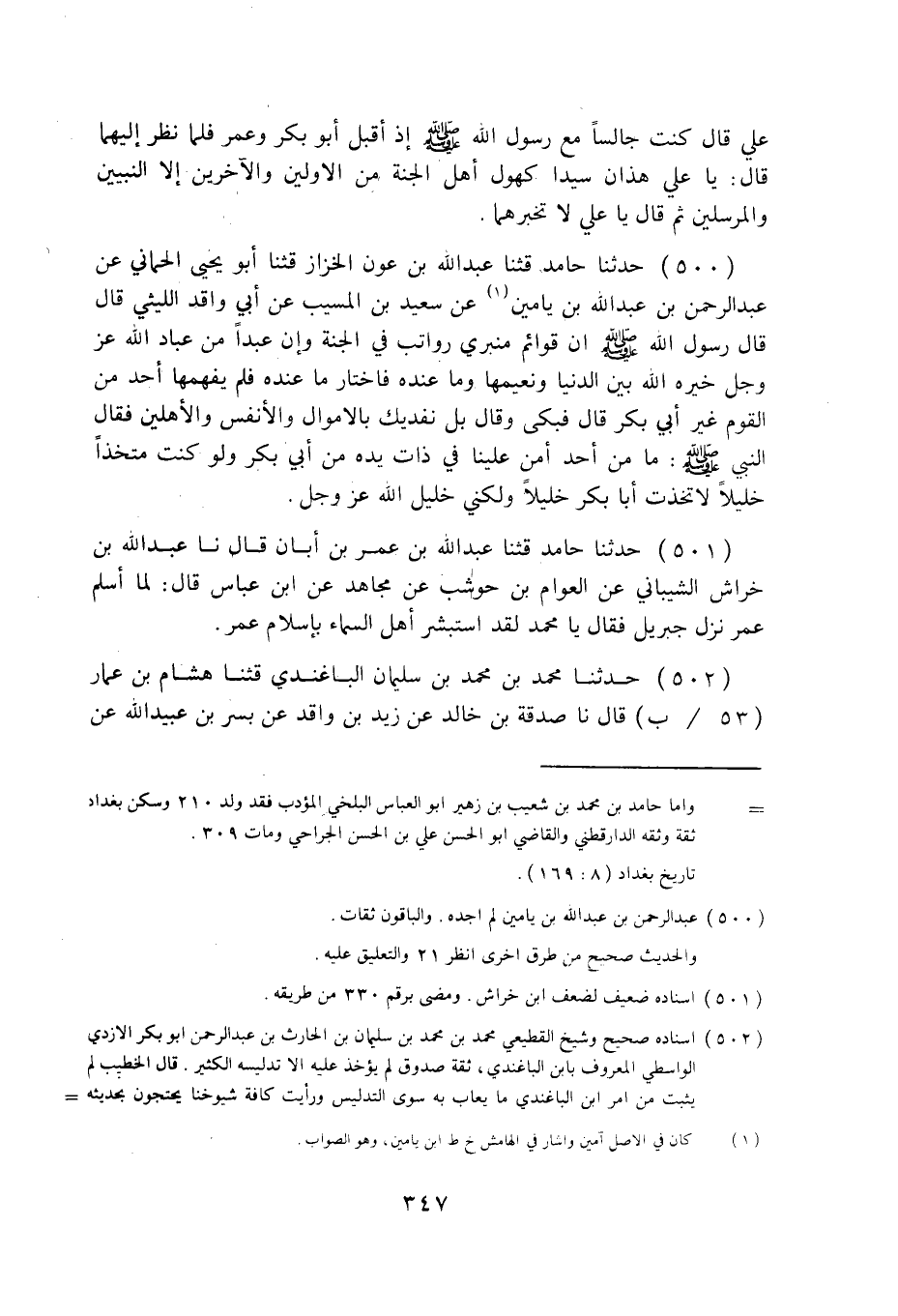 501 - حَدَّثَنَا حَامِدٌ قثنا عَبْدُ اللَّهِ بْنُ عُمَرَ بْنِ أَبَانَ قَالَ: نا عَبْدُ اللَّهِ بْنُ خِرَاشٍ الشَّيْبَانِيُّ، عَنِ الْعَوَّامِ بْنِ حَوْشَبٍ، عَنْ مُجَاهِدٍ، عَنِ ابْنِ عَبَّاسٍ قَالَ: §لَمَّا أَسْلَمَ عُمَرُ نَزَلَ جِبْرِيلُ فَقَالَ: يَا مُحَمَّدُ، لَقَدِ اسْتَبْشَرَ أَهْلُ السَّمَاءِ بِإِسْلَامِ عُمَرَ.