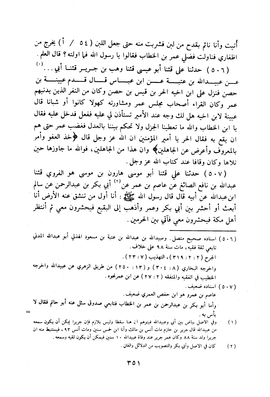 506 - حَدَّثَنَا عَلِيٌّ قثنا أَبُو عِيسَى قثنا وَهْبُ بْنُ جَرِيرٍ قثنا أَبِي، عَنْ عُبَيْدِ اللَّهِ بْنِ عُتْبَةَ، عَنِ ابْنِ عَبَّاسٍ قَالَ: قَدِمَ عُيَيْنَةُ بْنُ حِصْنٍ فَنَزَلَ عَلَى ابْنِ أَخِيهِ الْحُرِّ بْنِ قَيْسِ بْنِ حِصْنٍ، وَكَانَ مِنَ النَّفَرِ الَّذِينَ يُدْنِيهِمْ عُمَرُ، وَكَانَ الْقُرَّاءُ أَصْحَابَ مَجْلِسِ عُمَرَ وَمُشَاوَرَتِهِ، كُهُولًا كَانُوا أَوْ شُبَّانًا، قَالَ عُيَيْنَةُ لِابْنِ أَخِيهِ: هَلْ لَكَ وَجْهٌ عِنْدَ الْأَمِيرِ تَسْتَأْذِنُ لِي عَلَيْهِ؟ فَفَعَلَ، فَدَخَلَ عَلَيْهِ فَقَالَ: يَا ابْنَ الْخَطَّابِ، وَاللَّهِ مَا تُعْطِينَا الْجَزْلَ، وَلَا تَحْكُمُ بَيْنَنَا بِالْعَدْلِ، فَغَضِبَ عُمَرُ حَتَّى هَمَّ أَنْ يَقَعَ بِهِ، فَقَالَ الْحُرُّ: يَا أَمِيرَ الْمُؤْمِنِينَ، إِنَّ اللَّهَ عَزَّ وَجَلَّ قَالَ: {§خُذِ الْعَفْوَ وَأْمُرْ بِالْعُرْفِ وَأَعْرِضْ عَنِ الْجَاهِلِينَ} [الأعراف: 199] ، وَإِنَّ هَذَا مِنَ الْجَاهِلِينَ، فَوَاللَّهِ مَا جَاوَزَهَا حِينَ تَلَاهَا، وَكَانَ وَقَّافًا عِنْدَ كِتَابِ اللَّهِ عَزَّ وَجَلَّ.
