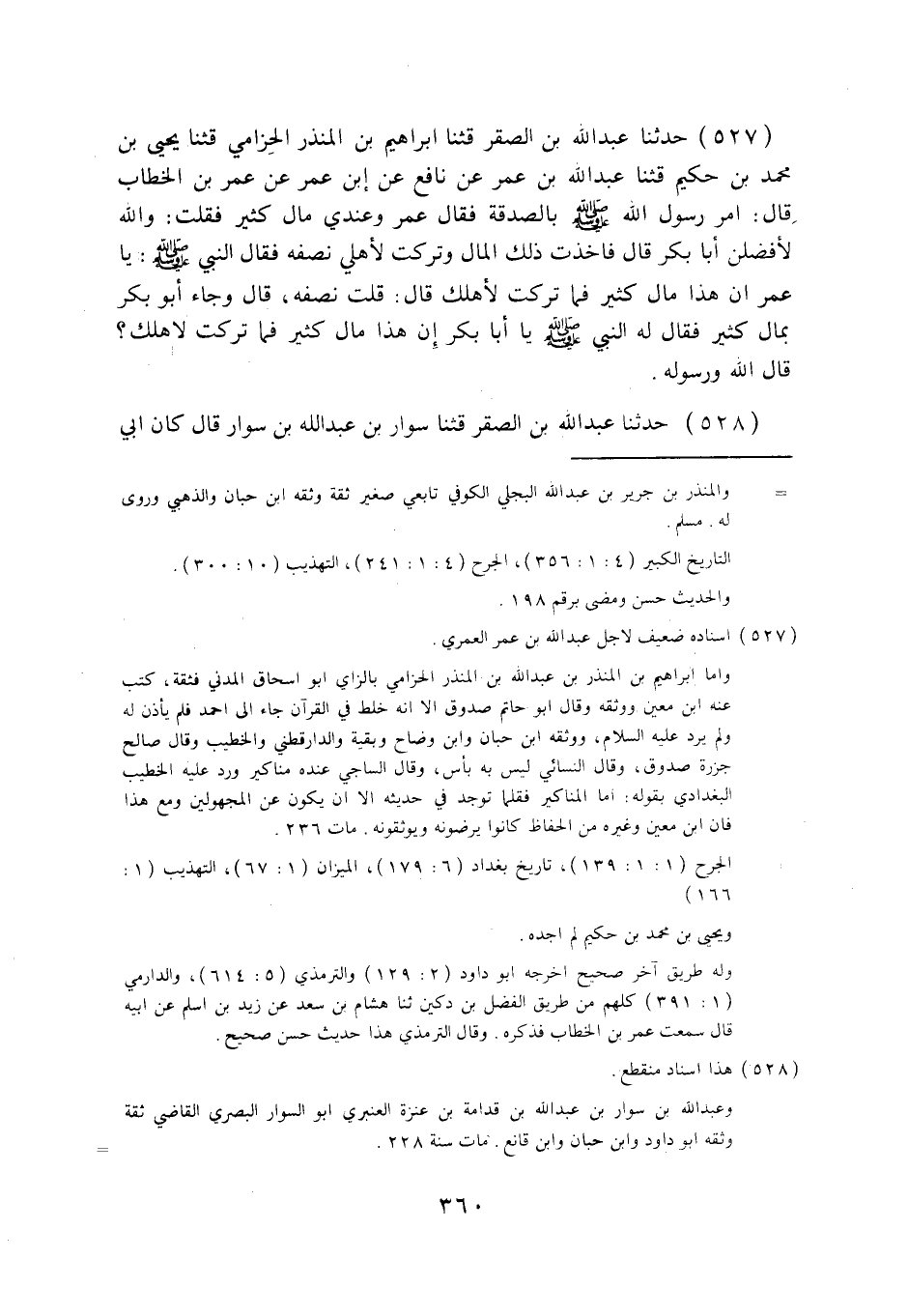 527 - حَدَّثَنَا عَبْدُ اللَّهِ بْنُ الصَّقْرِ قثنا إِبْرَاهِيمُ بْنُ الْمُنْذِرِ الْحِزَامِيُّ قثنا يَحْيَى بْنُ مُحَمَّدِ بْنِ حَكِيمٍ قثنا عَبْدُ اللَّهِ بْنُ عُمَرَ، عَنْ نَافِعٍ، عَنِ ابْنِ عُمَرَ، عَنْ عُمَرَ بْنِ الْخَطَّابِ قَالَ: أَمَرَ رَسُولُ اللَّهِ صَلَّى اللهُ عَلَيْهِ وَسَلَّمَ بِالصَّدَقَةِ، فَقَالَ عُمَرُ: وَعِنْدِي مَالٌ كَثِيرٌ، فَقُلْتُ: وَاللَّهِ لَأَفْضُلَنَّ أَبَا بَكْرٍ، قَالَ: فَأَخَذْتُ ذَلِكَ الْمَالَ وَتَرَكْتُ لِأَهْلِي نِصْفَهُ، فَقَالَ النَّبِيُّ صَلَّى اللهُ عَلَيْهِ وَسَلَّمَ: " §يَا عُمَرُ: إِنَّ هَذَا مَالٌ كَثِيرٌ، فَمَا تَرَكْتَ لِأَهْلِكَ؟ " قَالَ: قُلْتُ نِصْفَهُ، قَالَ: وَجَاءَ أَبُو بَكْرٍ بِمَالٍ كَثِيرٍ، فَقَالَ لَهُ النَّبِيُّ صَلَّى اللهُ عَلَيْهِ وَسَلَّمَ: «يَا أَبَا بَكْرٍ، إِنَّ هَذَا مَالٌ كَثِيرٌ، فَمَا تَرَكْتَ لِأَهْلِكَ؟» قَالَ: اللَّهَ وَرَسُولَهُ.