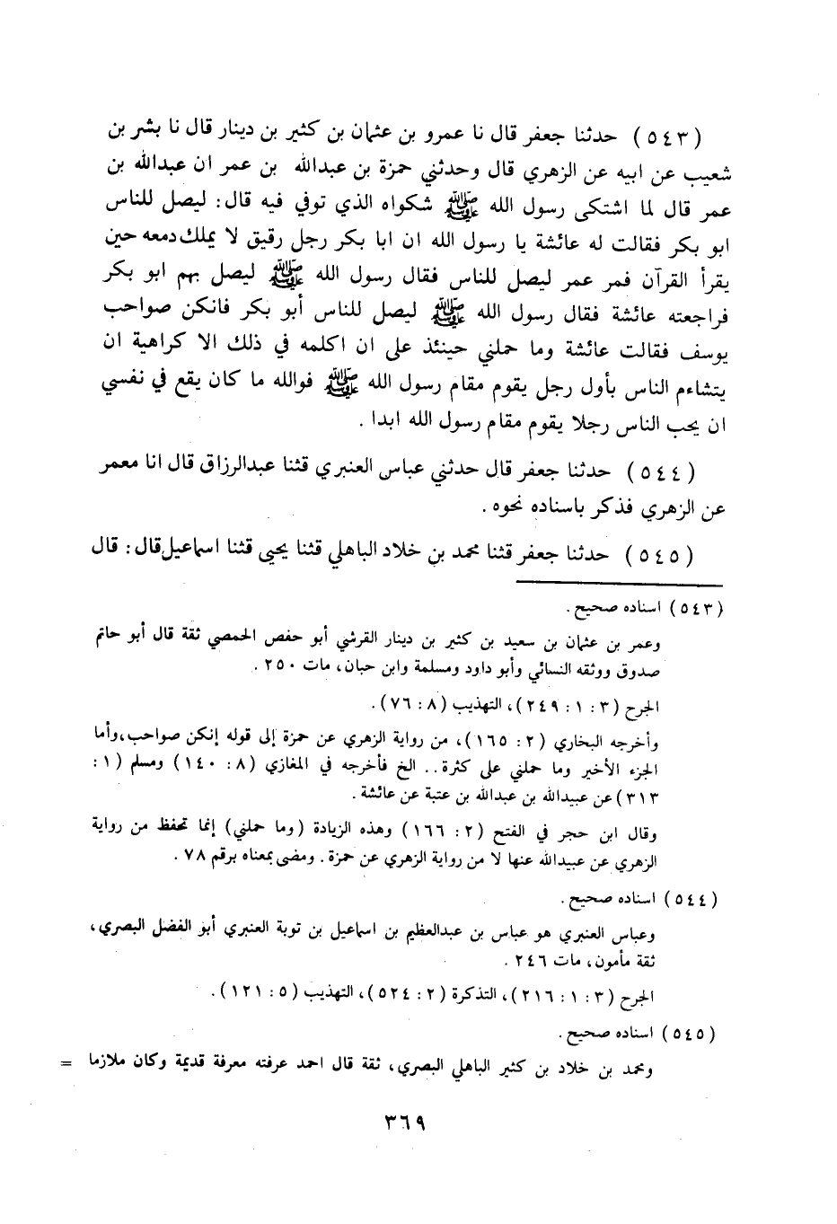 543 - حَدَّثَنَا جَعْفَرٌ قَالَ: نا عَمْرُو بْنُ عُثْمَانَ بْنِ كَثِيرِ بْنِ دِينَارٍ قَالَ نا بِشْرُ بْنُ شُعَيْبٍ، عَنْ أَبِيهِ، عَنِ الزُّهْرِيِّ قَالَ: وَحَدَّثَنِي حَمْزَةُ بْنُ عَبْدِ اللَّهِ بْنِ عُمَرَ، أَنَّ عَبْدَ اللَّهِ بْنَ عُمَرَ قَالَ: لَمَّا اشْتَكَى رَسُولُ اللَّهِ صَلَّى اللهُ عَلَيْهِ وَسَلَّمَ شَكْوَاهُ الَّذِي تُوُفِّيَ فِيهِ قَالَ: «§لِيُصَلِّ لِلنَّاسِ أَبُو بَكْرٍ» ، فَقَالَتْ لَهُ عَائِشَةُ: يَا رَسُولَ اللَّهِ، إِنَّ أَبَا بَكْرٍ رَجُلٌ رَقِيقٌ لَا يَمْلِكُ دَمْعَهُ حِينَ يَقْرَأُ الْقُرْآنَ، فَمُرْ عُمَرَ لِيُصَلِّ لِلنَّاسِ، فَقَالَ رَسُولُ اللَّهِ صَلَّى اللهُ عَلَيْهِ وَسَلَّمَ: «لِيُصَلِّ بِهِمْ أَبُو بَكْرٍ» ، فَرَاجَعَتْهُ عَائِشَةُ، فَقَالَ رَسُولُ اللَّهِ صَلَّى اللهُ عَلَيْهِ وَسَلَّمَ: «لِيُصَلِّ لِلنَّاسِ أَبُو بَكْرٍ، فَإِنَّكُنَّ صَوَاحِبُ يُوسُفَ» ، فَقَالَتْ عَائِشَةُ: وَمَا حَمَلَنِي حِينَئِذٍ عَلَى أَنْ أُكَلِّمَهُ فِي ذَلِكَ إِلَّا كَرَاهِيَةُ أَنْ يَتَشَاءَمَ النَّاسُ بِأَوَّلِ رَجُلٍ يَقُومُ مَقَامَ رَسُولِ اللَّهِ صَلَّى اللهُ عَلَيْهِ وَسَلَّمَ، فَوَاللَّهِ مَا كَانَ يَقَعُ فِي نَفْسِي أَنْ يُحِبَّ النَّاسُ رَجُلًا يَقُومُ مَقَامَ رَسُولِ اللَّهِ أَبَدًا.