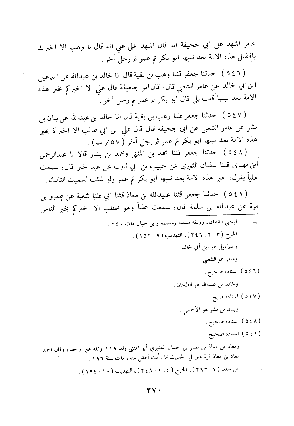 546 - حَدَّثَنَا جَعْفَرٌ قثنا وَهْبُ بْنُ بَقِيَّةَ قَالَ: أنا خَالِدُ بْنُ عَبْدِ اللَّهِ، عَنْ إِسْمَاعِيلَ بْنِ أَبِي خَالِدٍ، عَنْ عَامِرٍ الشَّعْبِيِّ قَالَ: قَالَ أَبُو جُحَيْفَةَ: قَالَ عَلِيٌّ: أَلَا §أُخْبِرُكُمْ بِخَيْرِ هَذِهِ الْأُمَّةِ بَعْدَ نَبِيِّهَا؟ قُلْتُ: بَلَى، قَالَ: أَبُو بَكْرٍ، ثُمَّ عُمَرُ، ثُمَّ رَجُلٌ آخَرُ.