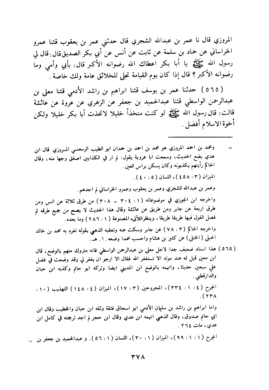 565 - حَدَّثَنَا عُمَرُ بْنُ يُوسُفَ قثنا إِبْرَاهِيمُ بْنُ رَاشِدٍ الْآدَمَيُّ قثنا مُعَلَّى بْنُ عَبْدِ الرَّحْمَنِ الْوَاسِطِيُّ قثنا عَبْدُ الْحَمِيدِ بْنُ جَعْفَرٍ، عَنِ الزُّهْرِيِّ، عَنْ عُرْوَةَ، عَنْ عَائِشَةَ قَالَتْ: قَالَ رَسُولُ اللَّهِ صَلَّى اللهُ عَلَيْهِ وَسَلَّمَ: «§لَوْ كُنْتُ مُتَّخِذًا خَلِيلًا لَاتَّخَذْتُ أَبَا بَكْرٍ خَلِيلًا، وَلَكِنْ أُخُوَّةُ الْإِسْلَامِ أَفْضَلُ» .