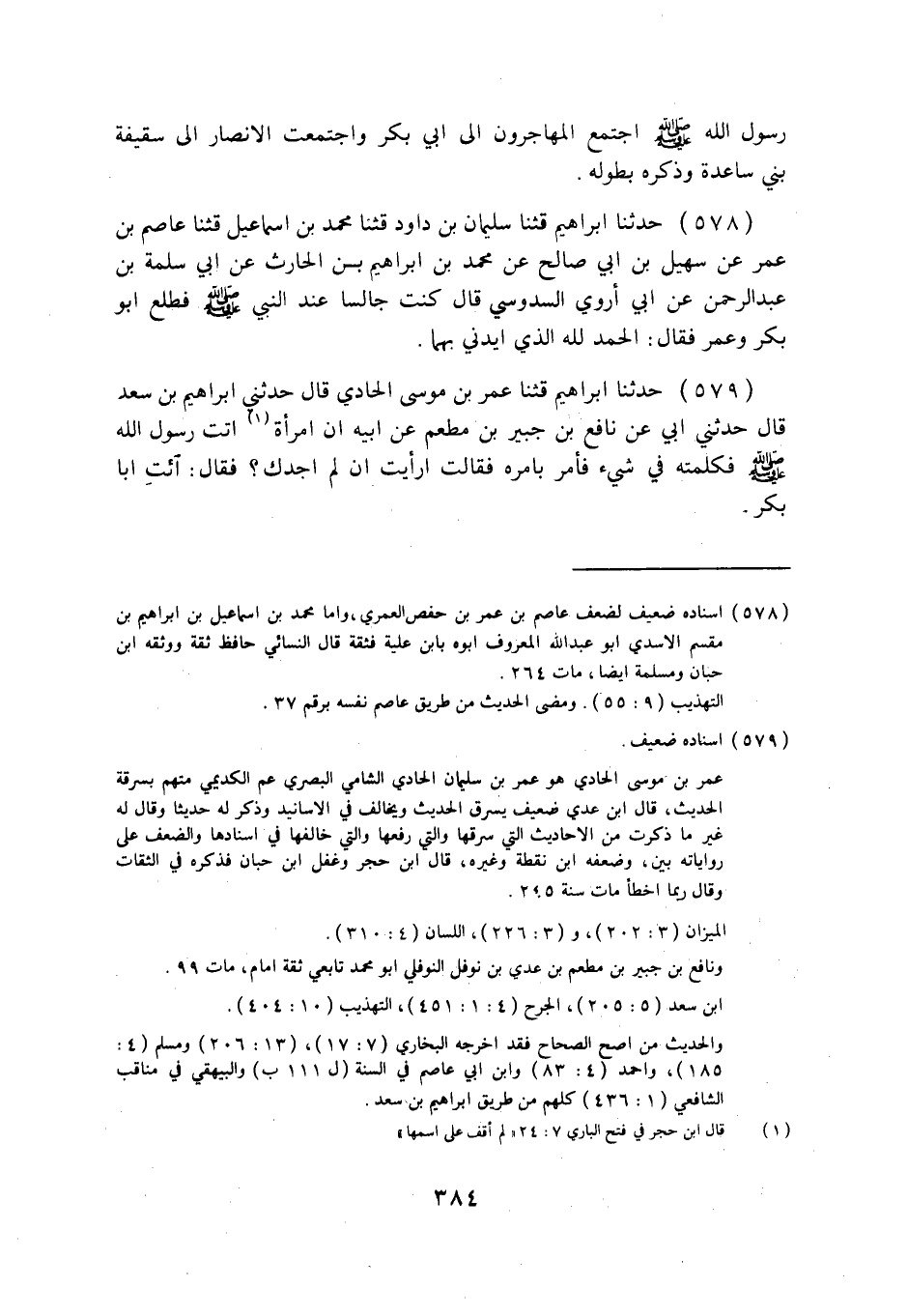 579 - حَدَّثَنَا إِبْرَاهِيمُ قثنا عُمَرُ بْنُ مُوسَى الْحَادِي قَالَ: حَدَّثَنِي إِبْرَاهِيمُ بْنُ سَعْدٍ قَالَ: حَدَّثَنِي أَبِي، عَنْ نَافِعِ بْنِ جُبَيْرِ بْنِ مُطْعِمٍ، عَنْ أَبِيهِ، أَنَّ امْرَأَةً أَتَتْ رَسُولَ اللَّهِ صَلَّى اللهُ عَلَيْهِ وَسَلَّمَ فَكَلَّمَتْهُ فِي شَيْءٍ، فَأَمَرَ بِأَمْرِهِ، فَقَالَتْ: أَرَأَيْتَ إِنْ لَمْ أَجِدْكَ؟ فَقَالَ: «§ائْتِ أَبَا بَكْرٍ» .
