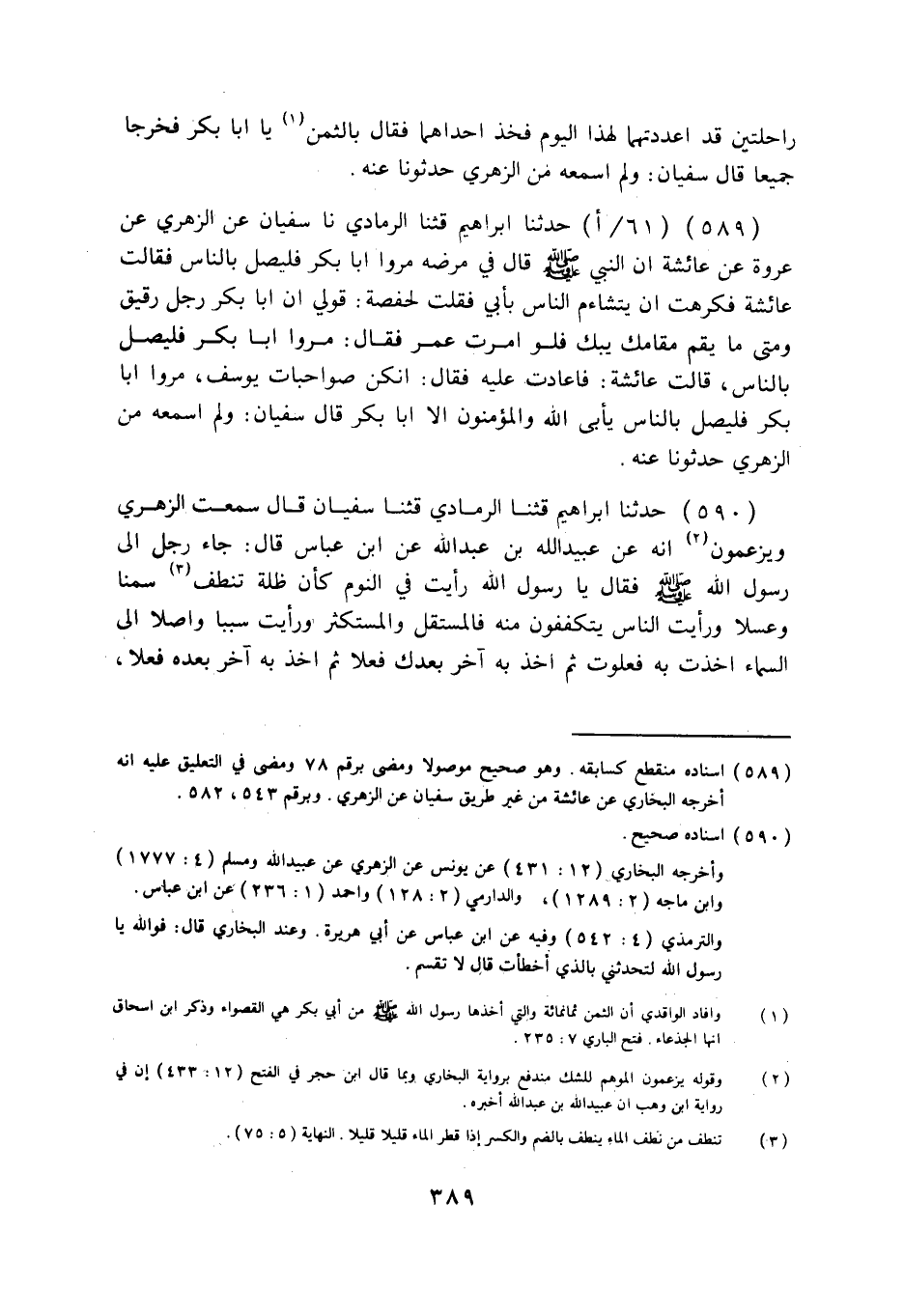 590 - حَدَّثَنَا إِبْرَاهِيمُ قثنا الرَّمَادِيُّ قثنا سُفْيَانُ قَالَ: سَمِعْتُ الزُّهْرِيَّ، وَيَزْعُمُونَ أَنَّهُ عَنْ عُبَيْدِ اللَّهِ بْنِ عَبْدِ اللَّهِ، عَنِ ابْنِ عَبَّاسٍ قَالَ: جَاءَ رَجُلٌ إِلَى رَسُولِ اللَّهِ صَلَّى اللهُ عَلَيْهِ وَسَلَّمَ فَقَالَ: يَا رَسُولَ اللَّهِ، رَأَيْتُ فِي النَّوْمِ كَأَنَّ ظُلَّةً تَنْطِفُ سَمْنًا وَعَسَلًا، وَرَأَيْتُ النَّاسَ يَتَكَفَّفُونَ مِنْهُ، فَالْمُسْتَقِلُّ وَالْمُسْتَكْثِرُ، وَرَأَيْتُ سَبَبًا وَاصِلًا إِلَى السَّمَاءِ أَخَذْتَ بِهِ فَعَلَوْتَ، ثُمَّ أَخَذَ بِهِ آخَرُ بَعْدَكَ فَعَلَا، ثُمَّ أَخَذَ بِهِ آخَرُ بَعْدَهُ فَعَلَا، ثُمَّ أَخَذَ بِهِ آخِذٌ بَعْدَهُ فَانْقَطَعَ، فَوُصِلَ لَهُ فَعَلَا، فَقَالَ أَبُو بَكْرٍ: يَا رَسُولَ اللَّهِ، دَعْنِي أَعْبُرْهَا، قَالَ: أَمَّا الظُّلَّةُ فَهُوَ الْإِسْلَامُ، وَأَمَّا مَا تَنْطِفُ مِنَ السَّمْنِ وَالْعَسَلِ، فَهُوَ الْقُرْآنُ حَلَاوَتُهُ وَلِينُهُ، وَالنَّاسُ يَتَكَفَّفُونَ مِنْهُ فَالْمُسْتَقِلُّ وَالْمُسْتَكْثِرُ، وَأَمَّا السَّبَبُ الْوَاصِلُ إِلَى السَّمَاءِ فَهُوَ الَّذِي أَنْتَ عَلَيْهِ مِنَ الْحَقِّ أَخَذْتَ بِهِ فَعَلَوْتَ، ثُمَّ أَخَذَ بِهِ آخَرُ بَعْدَكَ فَعَلَا، ثُمَّ أَخَذَ بِهِ آخَرُ بَعْدَهُ فَعَلَا، ثُمَّ أَخَذَ بِهِ آخَرُ بَعْدَهُ فَانْقَطَعَ فَوُصِلَ لَهُ، فَقَالَ: أَصَبْتُ يَا رَسُولَ اللَّهِ؟ قَالَ: «§أَصَبْتَ بَعْضًا، وَأَخْطَأْتَ بَعْضًا» ، قَالَ: أَقْسَمْتُ يَا رَسُولَ اللَّهِ، قَالَ: «لَا تُقْسِمْ يَا أَبَا بَكْرٍ» .