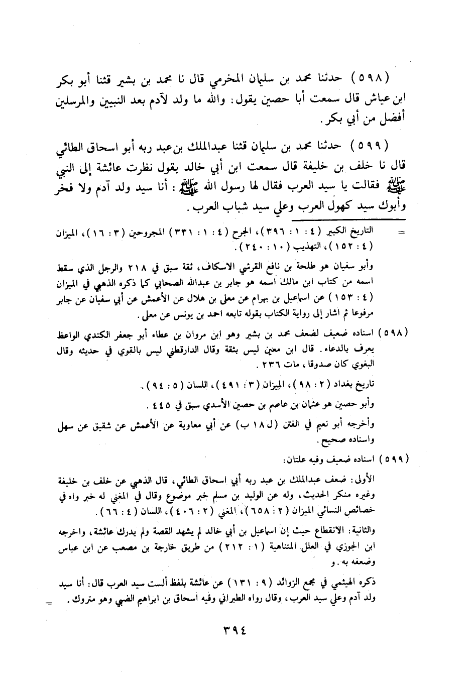 599 - حَدَّثَنَا مُحَمَّدُ بْنُ سُلَيْمَانَ قثنا عَبْدُ الْمَلِكِ بْنُ عَبْدِ رَبِّهِ أَبُو إِسْحَاقَ الطَّائِيُّ قَالَ: نا خَلَفُ بْنُ خَلِيفَةَ قَالَ: سَمِعْتُ ابْنَ أَبِي خَالِدٍ يَقُولُ: نَظَرَتْ عَائِشَةُ إِلَى النَّبِيِّ صَلَّى اللهُ عَلَيْهِ وَسَلَّمَ فَقَالَتْ: يَا سَيِّدَ الْعَرَبِ، فَقَالَ لَهَا رَسُولُ اللَّهِ صَلَّى اللهُ عَلَيْهِ وَسَلَّمَ: «§أَنَا سَيِّدُ وَلَدِ آدَمَ وَلَا فَخْرَ، وَأَبُوكِ سَيِّدُ كُهُولِ الْعَرَبِ، وَعَلِيٌّ سَيِّدُ شَبَابِ الْعَرَبِ» .