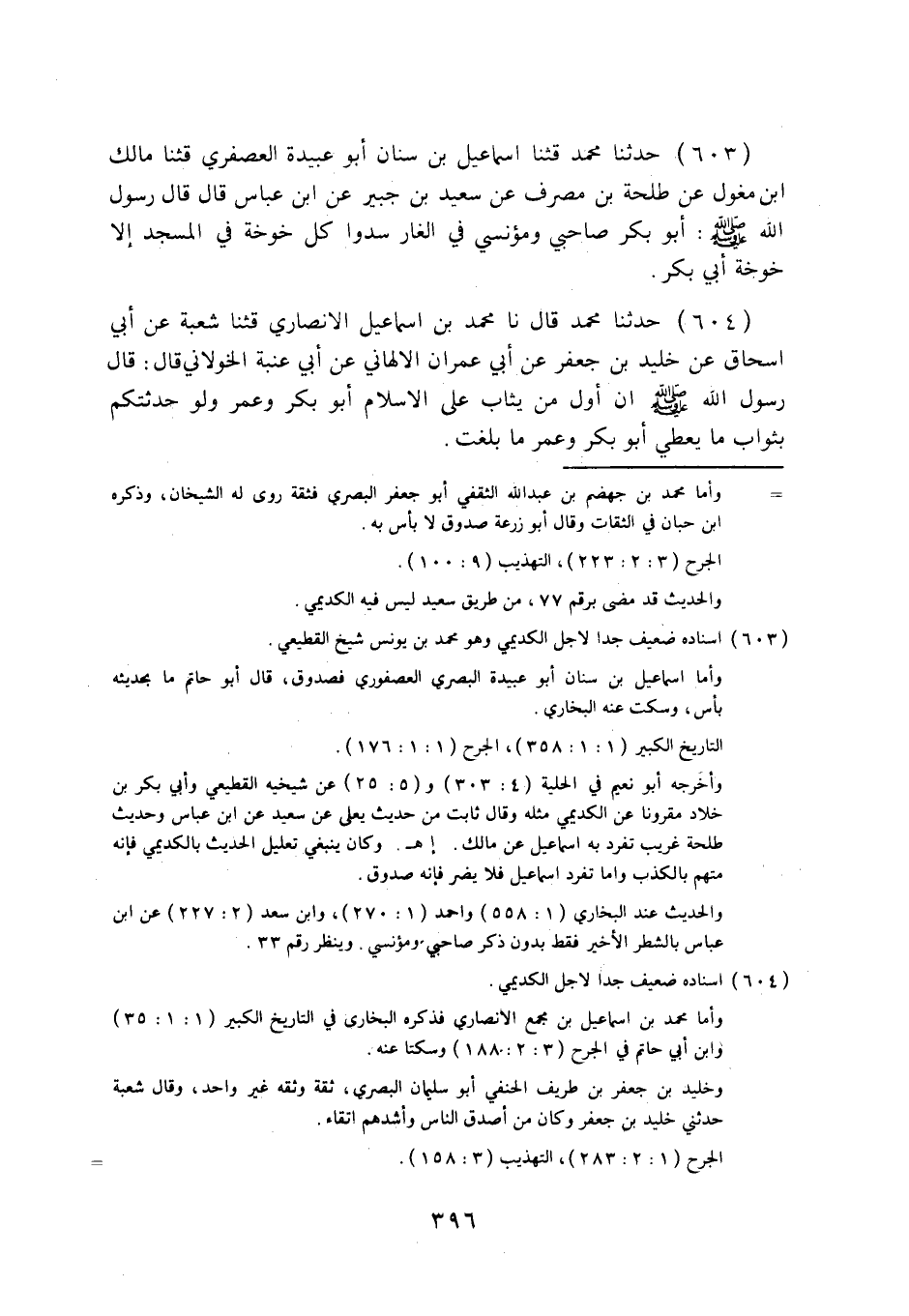 603 - حَدَّثَنَا مُحَمَّدٌ قثنا إِسْمَاعِيلُ بْنُ سِنَانٍ أَبُو عُبَيْدَةَ الْعُصْفُرِيُّ قثنا مَالِكُ بْنُ مِغْوَلٍ، عَنْ طَلْحَةَ بْنِ مُصَرِّفٍ، عَنْ سَعِيدِ بْنِ جُبَيْرٍ، عَنِ ابْنِ عَبَّاسٍ قَالَ: قَالَ رَسُولُ اللَّهِ صَلَّى اللهُ عَلَيْهِ وَسَلَّمَ: «§أَبُو بَكْرٍ صَاحِبِي وَمُؤْنِسِي فِي الْغَارِ، سُدُّوا كُلَّ خَوْخَةٍ فِي الْمَسْجِدِ إِلَّا خَوْخَةَ أَبِي بَكْرٍ» .