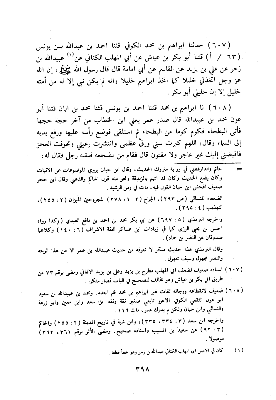 607 - حَدَّثَنَا إِبْرَاهِيمُ بْنُ مُحَمَّدٍ الْكُوفِيُّ قثنا أَحْمَدُ بْنُ عَبْدِ اللَّهِ بْنِ يُونُسَ قثنا أَبُو بَكْرِ بْنُ عَيَّاشٍ، عَنْ أَبِي الْمُهَلَّبِ الْكِنَانِيِّ، عَنْ عُبَيْدِ اللَّهِ بْنِ زَحْرٍ، عَنْ عَلِيِّ بْنِ يَزِيدَ، عَنِ الْقَاسِمِ، عَنْ أَبِي أُمَامَةَ قَالَ: قَالَ رَسُولُ اللَّهِ صَلَّى اللهُ عَلَيْهِ وَسَلَّمَ: «§إِنَّ اللَّهَ عَزَّ وَجَلَّ اتَّخَذَنِي خَلِيلًا كَمَا اتَّخَذَ إِبْرَاهِيمَ خَلِيلًا، وَإِنَّهُ لَمْ يَكُنْ نَبِيُّ إِلَّا لَهُ مِنْ أُمَّتِهِ خَلِيلٌ، أَلَا إِنَّ خَلِيلِي أَبُو بَكْرٍ» .