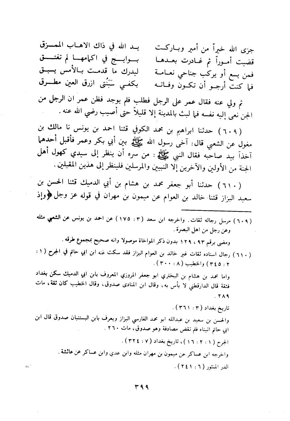 609 - حَدَّثَنَا إِبْرَاهِيمُ بْنُ مُحَمَّدٍ الْكُوفِيُّ قثنا أَحْمَدُ بْنُ يُونُسَ، نا مَالِكُ بْنُ مِغْوَلٍ، عَنِ الشَّعْبِيِّ قَالَ: آخَى رَسُولُ اللَّهِ صَلَّى اللهُ عَلَيْهِ وَسَلَّمَ بَيْنَ أَبِي بَكْرٍ وَعُمَرَ، فَأَقْبَلَ أَحَدُهُمَا آخِذًا بِيَدِ صَاحِبِهِ، فَقَالَ النَّبِيُّ صَلَّى اللهُ عَلَيْهِ وَسَلَّمَ: «§مَنْ سَرَّهُ أَنْ يَنْظُرَ إِلَى سَيِّدَيْ كُهُولِ أَهْلِ الْجَنَّةِ مِنَ الْأَوَّلِينَ وَالْآخِرِينَ إِلَّا النَّبِيِّينَ وَالْمُرْسَلِينَ، فَلْيَنْظُرْ إِلَى هَذَيْنِ الْمُقْبِلَيْنِ» .