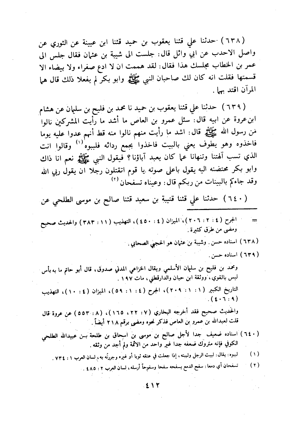 639 - حَدَّثَنَا عَلِيٌّ قثنا يَعْقُوبُ بْنُ حُمَيْدٍ، نا مُحَمَّدُ بْنُ فُلَيْحِ بْنِ سُلَيْمَانَ، عَنْ هِشَامِ بْنِ عُرْوَةَ، عَنْ أَبِيهِ قَالَ: سُئِلَ عَمْرُو بْنُ الْعَاصِ: مَا أَشَدُّ مَا رَأَيْتَ الْمُشْرِكِينَ نَالُوا مِنْ رَسُولِ اللَّهِ صَلَّى اللهُ عَلَيْهِ وَسَلَّمَ؟ قَالَ: أَشَدُّ مَا رَأَيْتُ مِنْهُمْ نَالُوا مِنْهُ قَطُّ أَنَّهُمْ عَدَوْا عَلَيْهِ يَوْمًا فَأَخَذُوهُ وَهُوَ يَطُوفُ، يَعْنِي بِالْبَيْتِ، فَأَخَذُوا بِجُمْعِ رِدَائِهِ فَلَبَّبُوهُ وَقَالُوا: أَنْتَ الَّذِي تَسُبُّ آلِهَتَنَا، وَتَنْهَانَا عَمَّا كَانَ يَعْبُدُ آبَاؤُنَا؟ فَيَقُولُ النَّبِيُّ صَلَّى اللهُ عَلَيْهِ وَسَلَّمَ: «نَعَمْ، أَنَا ذَاكَ» ، وَأَبُو بَكْرٍ مُحْتَضِنُهُ إِلَيْهِ يَقُولُ بِأَعْلَى صَوْتِهِ: يَا قَوْمِ، §أَتَقْتُلُونَ رَجُلًا أَنْ يَقُولَ: رَبِّيَ اللَّهُ، وَقَدْ جَاءَكُمْ بِالْبَيِّنَاتِ مِنْ رَبِّكُمْ؟ قَالَ: وَعَيْنَاهُ تَسْفَحَانِ.