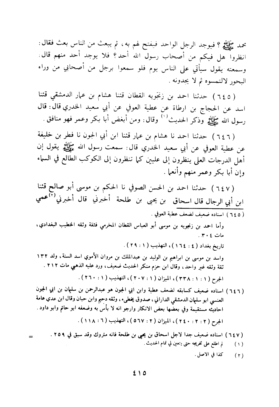 646 - حَدَّثَنَا أَحْمَدُ، نا هِشَامُ بْنُ عَمَّارٍ قثنا ابْنُ أَبِي الْجَوْنِ، نا فِطْرُ بْنُ خَلِيفَةَ، عَنْ عَطِيَّةَ الْعَوْفِيِّ، عَنْ أَبِي سَعِيدٍ الْخُدْرِيِّ قَالَ: سَمِعْتُ رَسُولَ اللَّهِ صَلَّى اللهُ عَلَيْهِ وَسَلَّمَ يَقُولُ: «إِنَّ §أَهْلَ الدَّرَجَاتِ الْعُلَى يَنْظُرُونَ إِلَى عِلِّيِّينَ كَمَا تَنْظُرُونَ إِلَى الْكَوْكَبِ الطَّالِعِ فِي السَّمَاءِ، وَإِنَّ أَبَا بَكْرٍ وَعُمَرَ مِنْهُمْ، وَأَنْعَمَا» .