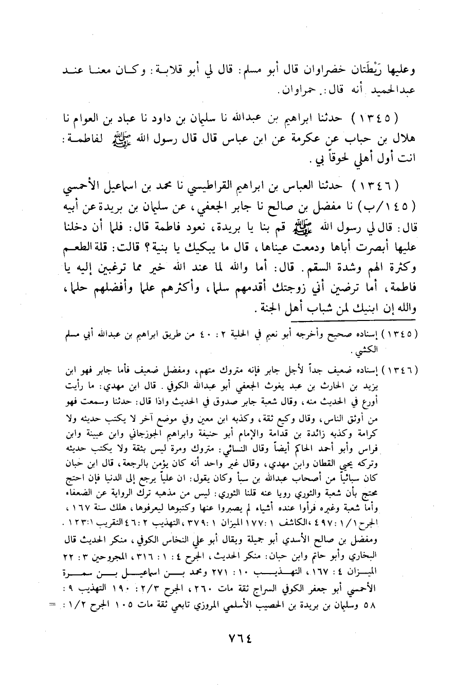 1346 - حَدَّثَنَا الْعَبَّاسُ بْنُ إِبْرَاهِيمَ الْقَرَاطِيسِيُّ، نا مُحَمَّدُ بْنُ إِسْمَاعِيلَ الْأَحْمَسِيُّ، نا مُفَضَّلُ بْنُ صَالِحٍ، نا جَابِرٌ الْجُعْفِيُّ، عَنْ سُلَيْمَانَ بْنِ بُرَيْدَةَ، عَنْ أَبِيهِ قَالَ: قَالَ لِي رَسُولُ اللَّهِ صَلَّى اللهُ عَلَيْهِ وَسَلَّمَ: «قُمْ بِنَا يَا بُرَيْدَةُ نَعُودُ فَاطِمَةَ» قَالَ: فَلَمَّا أَنْ دَخَلْنَا عَلَيْهَا أَبْصَرَتْ أَبَاهَا وَدَمِعَتْ عَيْنَاهَا قَالَ: «مَا يُبْكِيكِ يَا بُنَيَّةُ؟» قَالَتْ: قِلَّةُ الطَّعْمِ وَكَثْرَةُ الْهَمِّ، وَشِدَّةُ السَّقَمِ. قَالَ: «أَمَا وَاللَّهِ لَمَا §عِنْدَ اللَّهِ خَيْرٌ مِمَّا تَرْغَبِينَ إِلَيْهِ يَا فَاطِمَةُ، أَمَا تَرْضَيْنَ أَنِّي زَوَّجْتُكِ أَقْدَمَهُمْ سِلْمًا، وَأَكْثَرَهُمْ عِلْمًا وَأَفْضَلَهُمْ حِلْمًا، وَاللَّهِ إِنَّ ابْنَيْكِ لَمِنْ شَبَابِ أَهْلِ الْجَنَّةِ» .