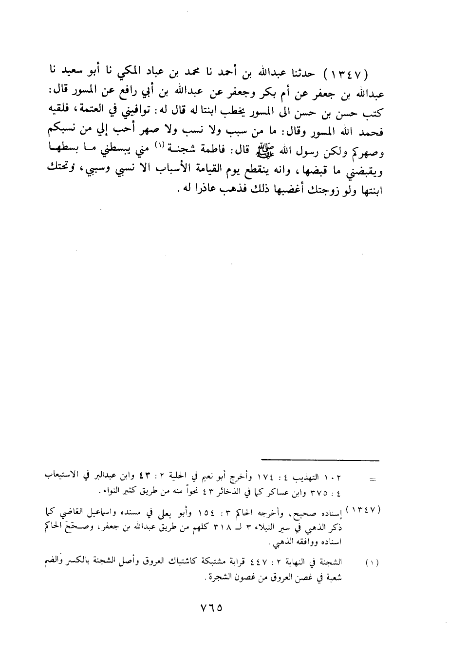 1347 - حَدَّثَنَا عَبْدُ اللَّهِ بْنُ أَحْمَدَ، نا مُحَمَّدُ بْنُ عَبَّادٍ الْمَكِّيُّ، نا أَبُو سَعِيدٍ، نا عَبْدُ اللَّهِ بْنُ جَعْفَرٍ، عَنْ أُمِّ بَكْرٍ، وَجَعْفَرٍ، عَنْ عَبْدِ اللَّهِ بْنِ أَبِي رَافِعٍ، عَنِ الْمِسْوَرِ قَالَ: كَتَبَ حَسَنُ بْنُ حَسَنٍ إِلَى الْمِسْوَرِ يَخْطُبُ ابْنَةً لَهُ قَالَ لَهُ: تُوَافِينِي فِي الْعَتَمَةِ، فَلَقِيَهُ فَحَمِدَ اللَّهَ الْمِسْوَرُ وَقَالَ: مَا مِنْ سَبَبٍ، وَلَا نَسَبٍ، وَلَا صِهْرٍ، أَحَبَّ إِلَيَّ مِنْ نَسَبِكُمْ، وَصِهْرِكُمْ، وَلَكِنْ رَسُولُ اللَّهِ صَلَّى اللهُ عَلَيْهِ وَسَلَّمَ قَالَ: «§فَاطِمَةُ شُجْنَةٌ مِنِّي يَبْسُطُنِي مَا بَسَطَهَا، وَيَقْبِضُنِي مَا قَبَضَهَا، وَأَنَّهُ يَنْقَطِعُ يَوْمَ الْقِيَامَةِ الْأَسْبَابُ إِلَّا نَسَبِي وَسَبَبِي» ، وَتَحْتَكَ ابْنَتُهَا، وَلَوْ زَوَّجْتُكَ أَغْضَبَهَا ذَلِكَ فَذَهَبَ عَاذِرًا لَهُ.