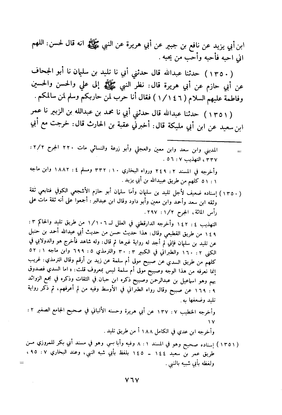 1350 - حَدَّثَنَا عَبْدُ اللَّهِ قَالَ: حَدَّثَنِي أَبِي، نا تَلِيدُ بْنُ سُلَيْمَانَ، نا أَبُو الْجَحَّافِ، عَنْ أَبِي حَازِمٍ، عَنْ أَبِي هُرَيْرَةَ قَالَ: نَظَرَ النَّبِيُّ صَلَّى اللهُ عَلَيْهِ وَسَلَّمَ إِلَى عَلِيٍّ، وَالْحَسَنِ، وَالْحُسَيْنِ وَفَاطِمَةَ عَلَيْهِمُ السَّلَامُ فَقَالَ: «§أَنَا حَرْبٌ لِمَنْ حَارَبَكُمْ، وَسِلْمٌ لِمَنْ سَالَمَكُمْ» .