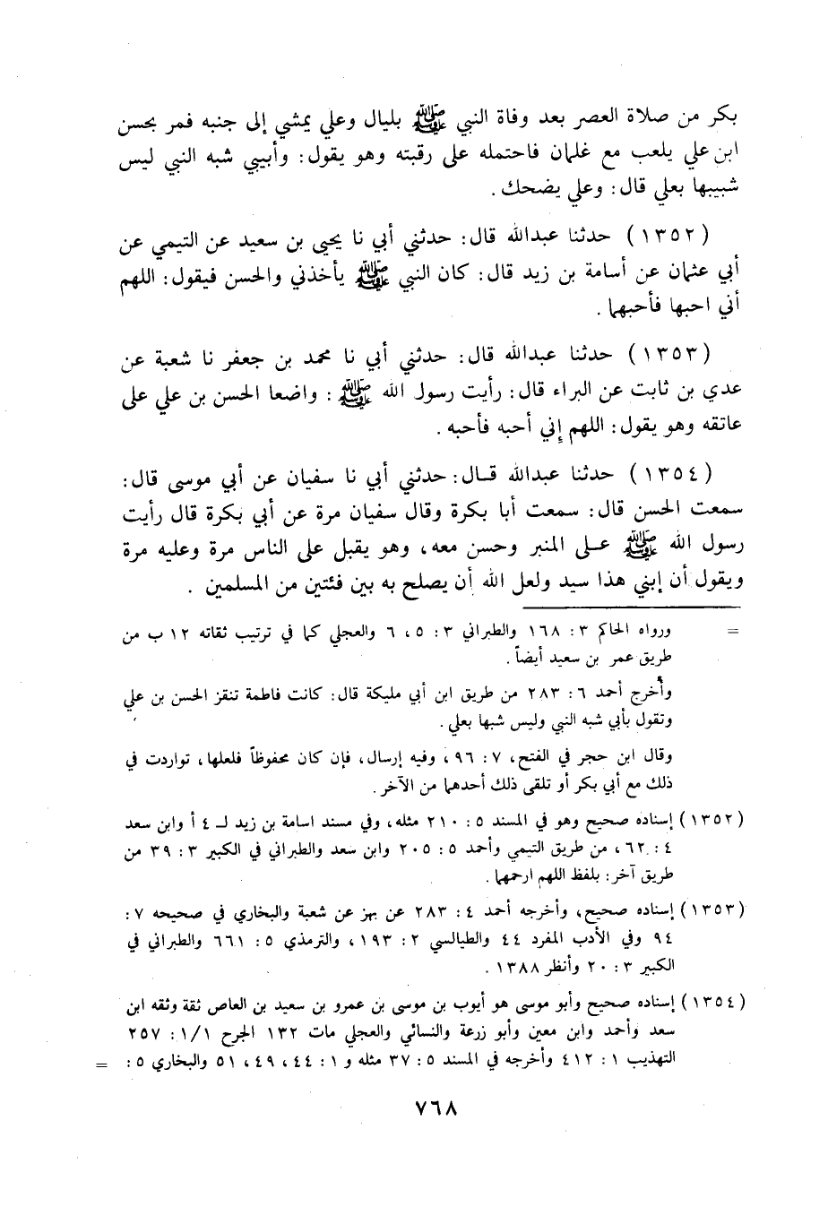 1352 - حَدَّثَنَا عَبْدُ اللَّهِ قَالَ: حَدَّثَنِي أَبِي، نا يَحْيَى بْنُ سَعِيدٍ، عَنِ التَّيْمِيِّ، عَنْ أَبِي عُثْمَانَ، عَنْ أُسَامَةَ بْنِ زَيْدٍ قَالَ: كَانَ النَّبِيُّ صَلَّى اللهُ عَلَيْهِ وَسَلَّمَ يَأْخُذُنِي وَالْحَسَنَ فَيَقُولُ: «§اللَّهُمَّ إِنِّي أُحِبُّهَا فَأَحِبَّهُمَا» .
