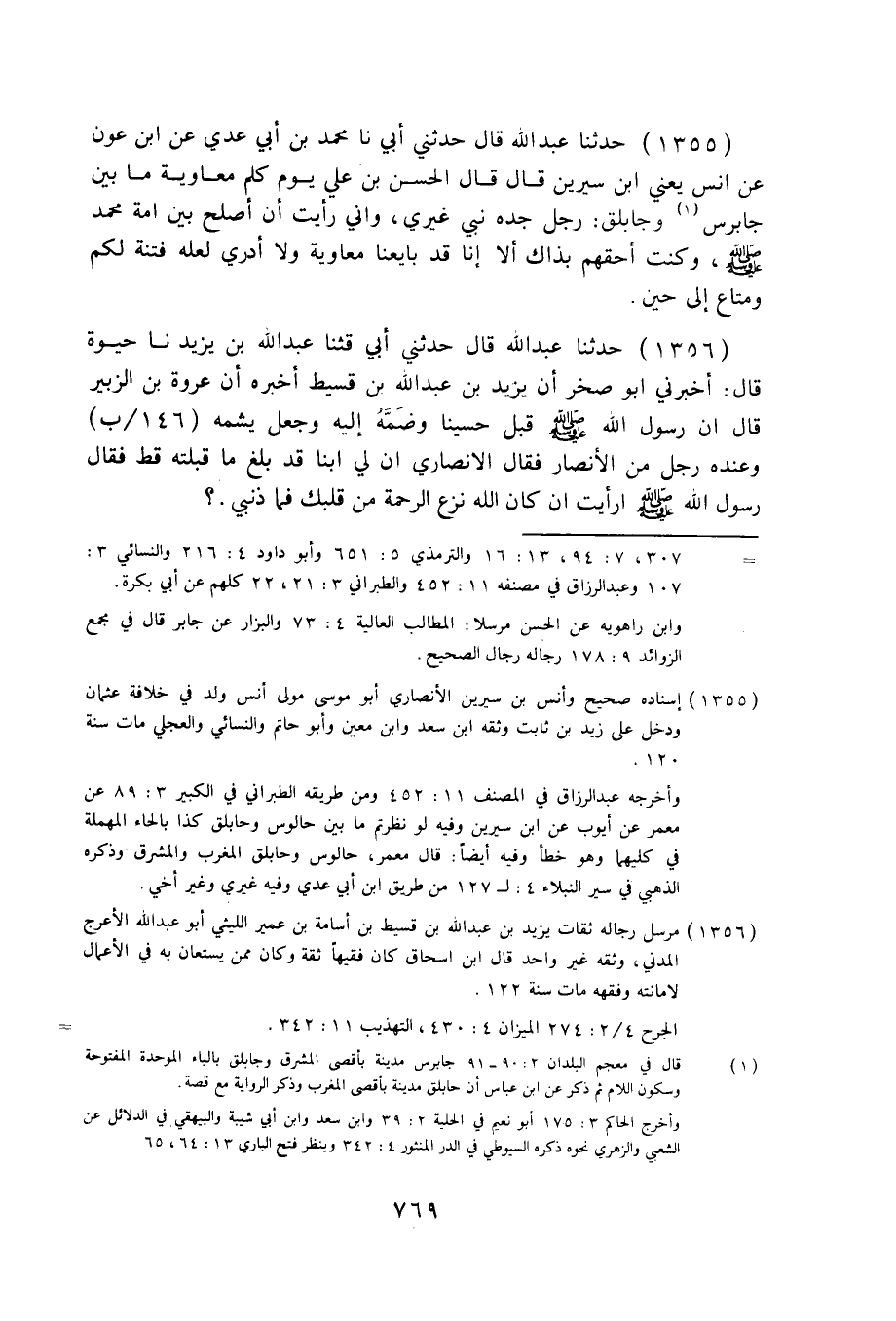 1355 - حَدَّثَنَا عَبْدُ اللَّهِ قَالَ: حَدَّثَنِي أَبِي، نا مُحَمَّدُ بْنُ أَبِي عَدِيٍّ، عَنِ ابْنِ عَوْنٍ، عَنْ أَنَسٍ، يَعْنِي: ابْنَ سِيرِينَ قَالَ: قَالَ الْحَسَنُ بْنُ عَلِيٍّ يَوْمَ كَلَّمَ مُعَاوِيَةَ مَا بَيْنَ جَابِرْسَ وَجَابِلْقَ: «رَجُلٌ جَدُّهُ نَبِيٌّ غَيْرِي §وَإِنِّي رَأَيْتُ أَنْ أُصْلِحَ بَيْنَ أُمَّةِ مُحَمَّدٍ صَلَّى اللهُ عَلَيْهِ وَسَلَّمَ، وَكُنْتُ أَحَقَّهُمْ بِذَاكَ أَلَا إِنَّا قَدْ بَايَعْنَا مُعَاوِيَةَ وَلَا أَدْرِي لَعَلَّهُ فِتْنَةٌ لَكُمْ وَمَتَاعٌ إِلَى حِينٍ»