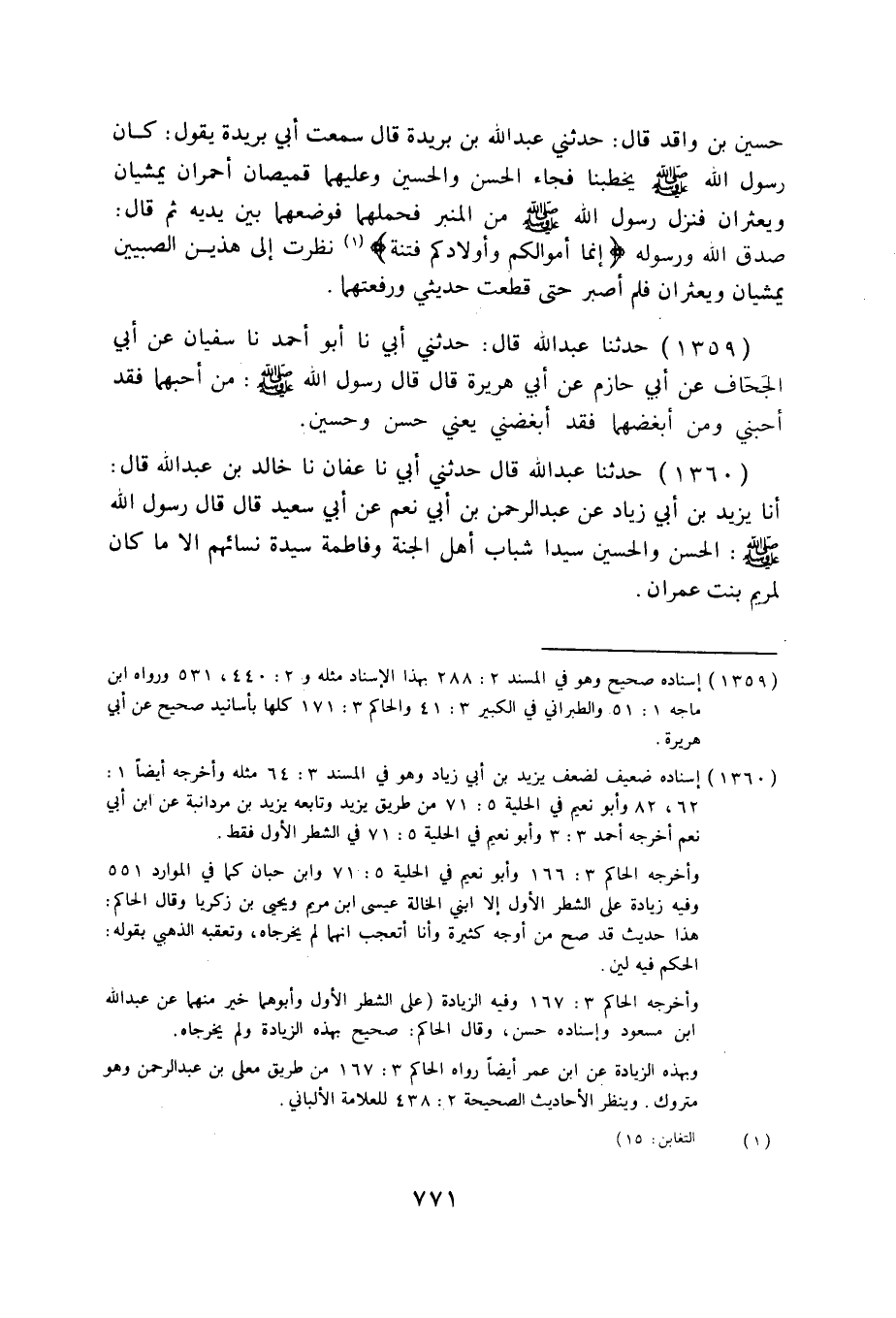 1360 - حَدَّثَنَا عَبْدُ اللَّهِ قَالَ: حَدَّثَنِي أَبِي، نا عَفَّانُ، نا خَالِدُ بْنُ عَبْدِ اللَّهِ قَالَ: أنا يَزِيدُ بْنُ أَبِي زِيَادٍ، عَنْ عَبْدِ الرَّحْمَنِ بْنِ أَبِي نُعْمٍ، عَنْ أَبِي سَعِيدٍ قَالَ: قَالَ رَسُولُ اللَّهِ صَلَّى اللهُ عَلَيْهِ وَسَلَّمَ: «§الْحَسَنُ، وَالْحُسَيْنُ سَيِّدَا شَبَابِ أَهْلِ الْجَنَّةِ، وَفَاطِمَةُ سَيِّدَةُ نِسَائِهِمْ إِلَّا مَا كَانَ لِمَرْيَمَ بِنْتِ عِمْرَانَ» .