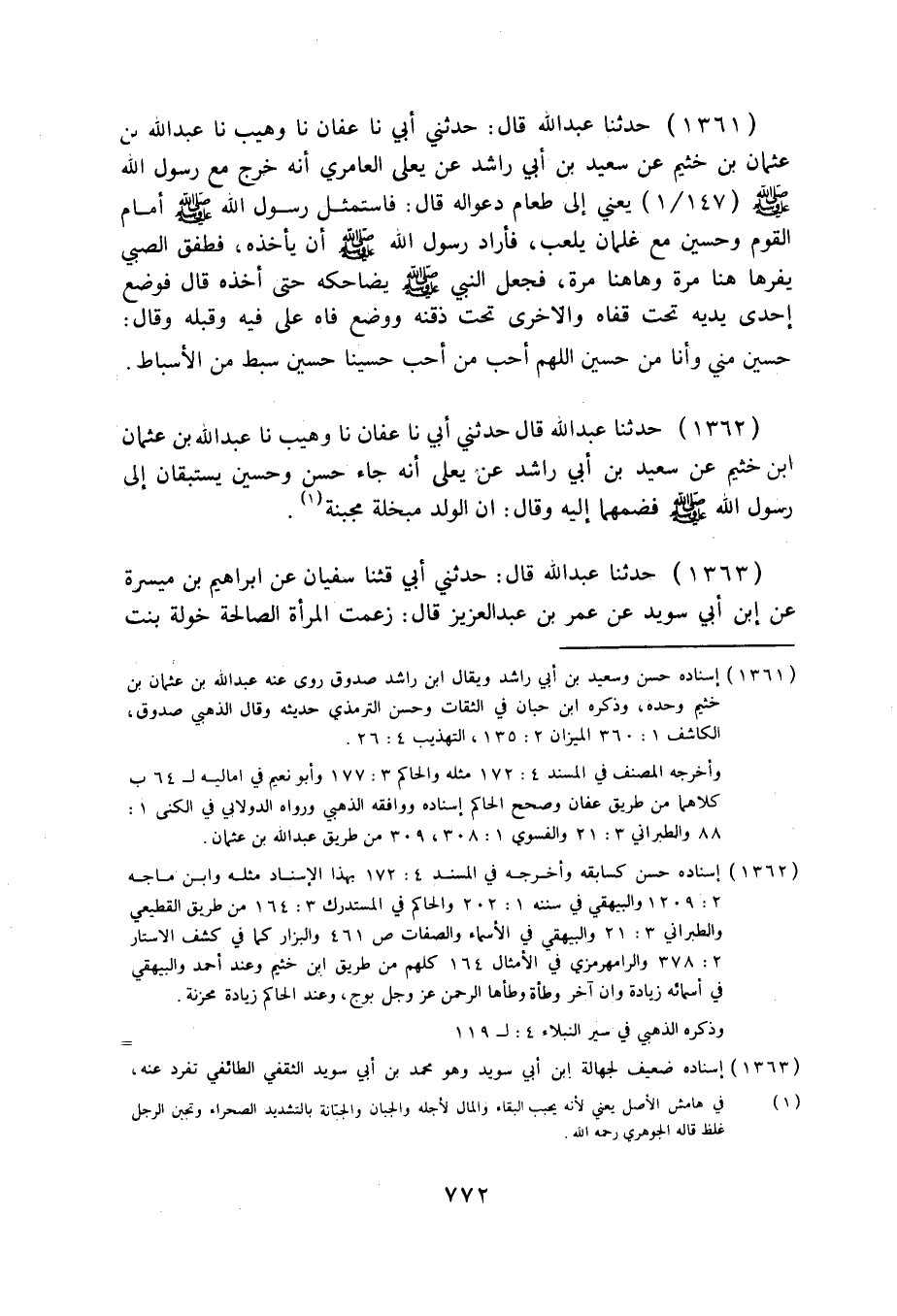 1361 - حَدَّثَنَا عَبْدُ اللَّهِ قَالَ: حَدَّثَنِي أَبِي، نا عَفَّانُ، نا وُهَيْبٌ، نا عَبْدُ اللَّهِ بْنُ عُثْمَانَ بْنِ خُثَيْمٍ، عَنْ سَعِيدِ بْنِ أَبِي رَاشِدٍ، عَنْ يَعْلَى الْعَامِرِيِّ، أَنَّهُ خَرَجَ مَعَ رَسُولِ اللَّهِ صَلَّى اللهُ عَلَيْهِ وَسَلَّمَ - يَعْنِي إِلَى طَعَامٍ دُعُوا لَهُ قَالَ: فَاسْتَمْثَلَ رَسُولُ اللَّهِ صَلَّى اللهُ عَلَيْهِ وَسَلَّمَ أَمَامَ الْقَوْمِ، وَحُسَيْنٌ مَعَ غِلْمَانٍ يَلْعَبُ، فَأَرَادَ رَسُولُ اللَّهِ صَلَّى اللهُ عَلَيْهِ وَسَلَّمَ أَنْ يَأْخُذَهُ، فَطَفِقَ الصَّبِيُّ يَفِرُّهَا هُنَا مَرَّةً وَهَا هُنَا مَرَّةً، فَجَعَلَ النَّبِيُّ صَلَّى اللهُ عَلَيْهِ وَسَلَّمَ يُضَاحِكُهُ حَتَّى أَخَذَهُ قَالَ: فَوَضَعَ إِحْدَى يَدَيْهِ تَحْتَ قَفَاهُ وَالْأُخْرَى تَحْتَ ذَقْنِهِ وَوَضَعَ فَاهُ عَلَى فِيهِ وَقَبَّلَهُ وَقَالَ: «§حُسَيْنٌ مِنِّي، وَأَنَا مِنْ حُسَيْنٍ، اللَّهُمَّ أَحِبَّ مَنْ أَحَبَّ حُسَيْنًا حُسَيْنٌ سِبْطٌ مِنَ الْأَسْبَاطِ» .