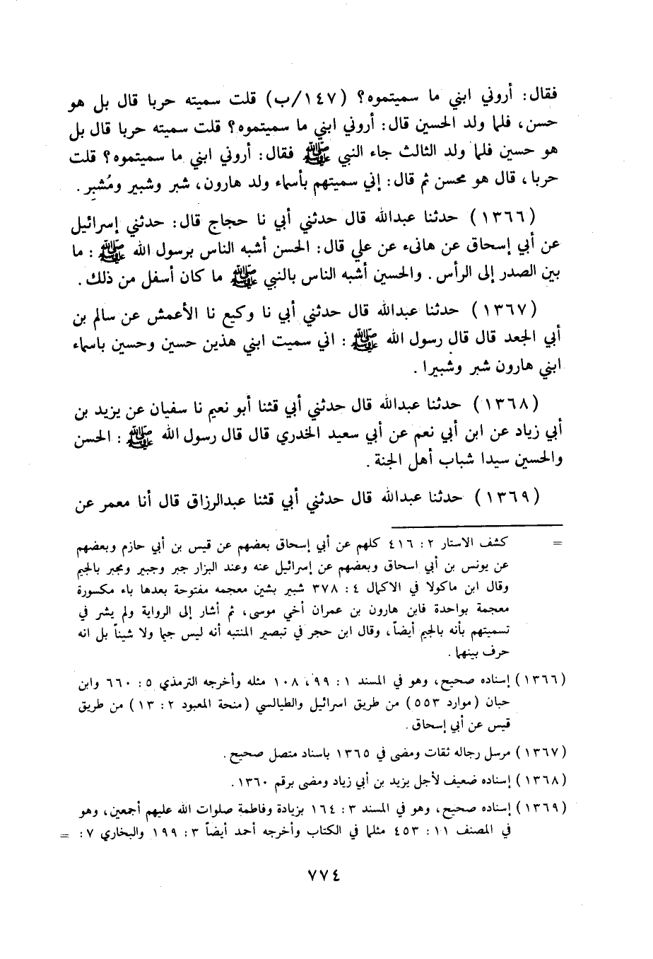 1366 - حَدَّثَنَا عَبْدُ اللَّهِ قَالَ: حَدَّثَنِي أَبِي، نا حَجَّاجٌ قَالَ: حَدَّثَنِي إِسْرَائِيلُ، عَنْ أَبِي إِسْحَاقَ، عَنْ هَانِئٍ، عَنْ عَلِيٍّ قَالَ: §الْحَسَنُ أَشْبَهُ النَّاسِ بِرَسُولِ اللَّهِ صَلَّى اللهُ عَلَيْهِ وَسَلَّمَ مَا بَيْنَ الصَّدْرِ إِلَى الرَّأْسِ، وَالْحُسَيْنُ أَشْبَهُ النَّاسِ بِالنَّبِيِّ صَلَّى اللهُ عَلَيْهِ وَسَلَّمَ مَا كَانَ أَسْفَلَ مِنْ ذَلِكَ ".