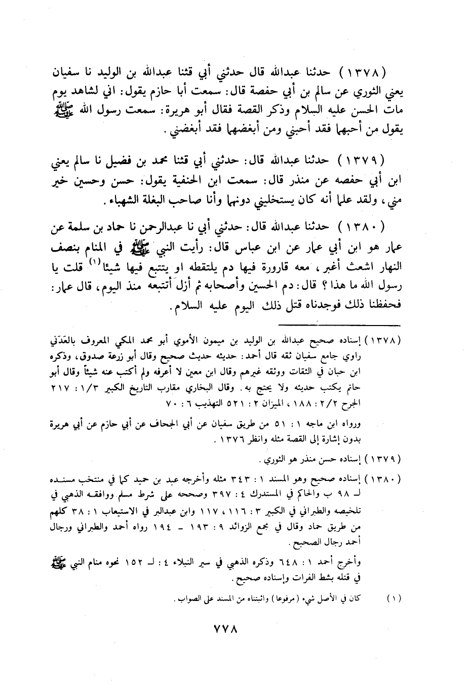 1380 - حَدَّثَنَا عَبْدُ اللَّهِ قَالَ: حَدَّثَنِي أَبِي، نا عَبْدُ الرَّحْمَنِ، نا حَمَّادُ بْنُ سَلَمَةَ، عَنْ عَمَّارٍ هُوَ ابْنُ أَبِي عَمَّارٍ، عَنِ ابْنِ عَبَّاسٍ قَالَ: " §رَأَيْتُ النَّبِيَّ صَلَّى اللهُ عَلَيْهِ وَسَلَّمَ فِي الْمَنَامِ بِنِصْفِ النَّهَارِ أَشْعَثَ أَغْبَرَ، مَعَهُ قَارُورَةٌ فِيهَا دَمٌ يَلْتَقِطُهُ، أَوْ يَتَتَبَّعُ فِيهَا شَيْئًا قُلْتُ: يَا رَسُولَ اللَّهِ، مَا هَذَا؟ قَالَ: دَمُ الْحُسَيْنِ وَأَصْحَابِهِ لَمْ أَزَلْ أَتَتَبَّعُهُ مُنْذُ الْيَوْمَ قَالَ عَمَّارٌ: فَحَفِظْنَا ذَلِكَ فَوَجَدْنَاهُ قُتِلَ ذَلِكَ الْيَوْمَ عَلَيْهِ السَّلَامُ ".