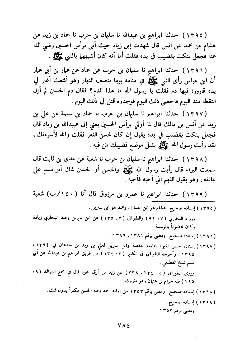 1395 - حَدَّثَنَا إِبْرَاهِيمُ بْنُ عَبْدِ اللَّهِ، نا سُلَيْمَانُ بْنُ حَرْبٍ، نا حَمَّادُ بْنُ زَيْدٍ، عَنْ هِشَامٍ، عَنْ مُحَمَّدٍ، عَنْ أَنَسٍ قَالَ: شَهِدْتُ ابْنَ زِيَادٍ حَيْثُ أَتَى بِرَأْسِ الْحُسَيْنِ رَضِيَ اللَّهُ عَنْهُ فَجَعَلَ يَنْكُتُ بِقَضِيبٍ فِي يَدِهِ، فَقُلْتُ: «§أَمَا إِنَّهُ كَانَ أَشْبَهَهُمَا بِالنَّبِيِّ صَلَّى اللهُ عَلَيْهِ وَسَلَّمَ» .