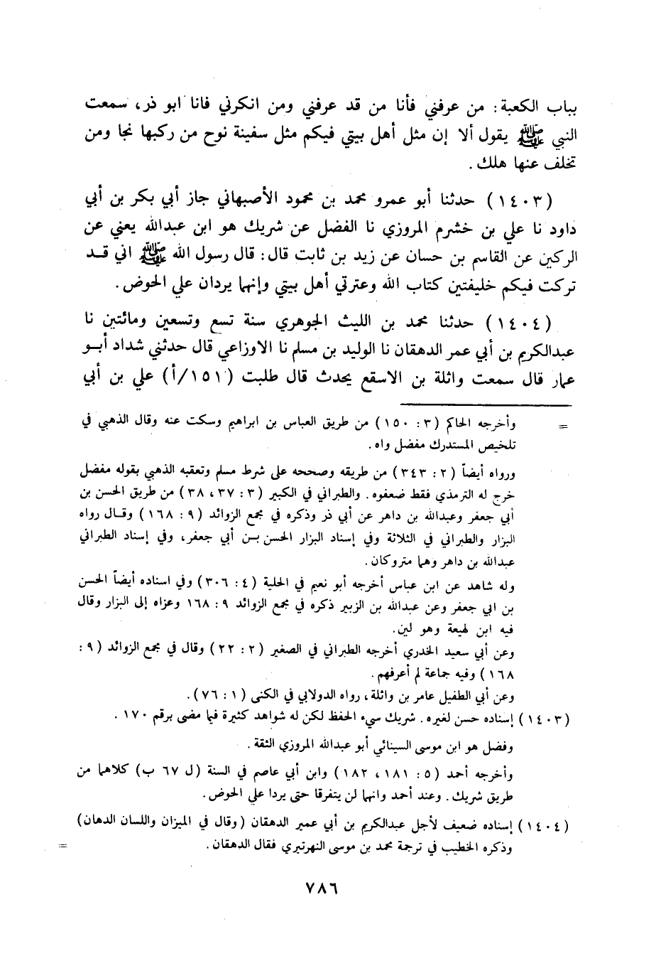 1403 - حَدَّثَنَا أَبُو عَمْرٍو مُحَمَّدُ بْنُ مَحْمُودٍ الْأَصْبَهَانِيُّ، جَارُ أَبِي بَكْرِ بْنِ أَبِي دَاوُدَ، نا عَلِيُّ بْنُ خَشْرَمٍ الْمَرْوَزِيُّ، نا الْفَضْلُ، عَنْ شَرِيكٍ هُوَ ابْنُ عَبْدِ اللَّهِ، يَعْنِي عَنِ الرُّكَيْنِ، عَنِ الْقَاسِمِ بْنِ حَسَّانَ، عَنْ زَيْدِ بْنِ ثَابِتٍ قَالَ: قَالَ رَسُولُ اللَّهِ صَلَّى اللهُ عَلَيْهِ وَسَلَّمَ: «§إِنِّي قَدْ تَرَكْتُ فِيكُمْ خَلِيفَتَيْنِ، كِتَابَ اللَّهِ وَعِتْرَتِي أَهْلَ بَيْتِي، وَإِنَّهُمَا يَرِدَانِ عَلَيَّ الْحَوْضَ» .