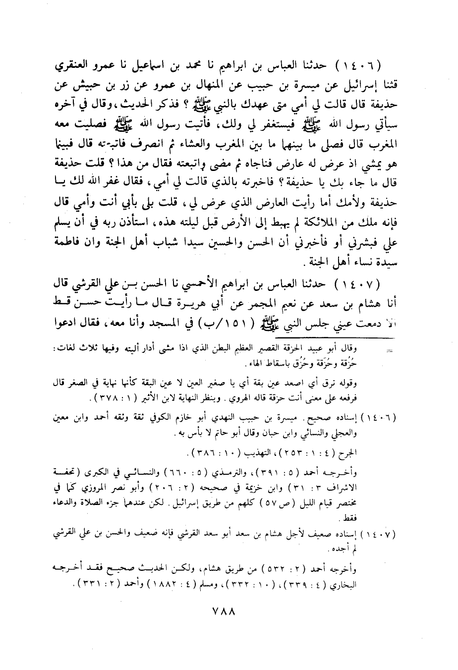 1406 - حَدَّثَنَا الْعَبَّاسُ بْنُ إِبْرَاهِيمَ، نا مُحَمَّدُ بْنُ إِسْمَاعِيلَ، نا عَمْرٌو الْعَنْقَزِيُّ قثنا إِسْمَاعِيلُ، عَنْ مَيْسَرَةَ بْنِ حَبِيبٍ، عَنِ الْمِنْهَالِ بْنِ عَمْرٍو، عَنْ زِرِّ بْنِ حُبَيْشٍ، عَنْ حُذَيْفَةَ قَالَ: قَالَتْ لِي أُمِّي: مَتَى عَهْدُكَ بِالنَّبِيِّ صَلَّى اللهُ عَلَيْهِ وَسَلَّمَ؟ فَذَكَرَ الْحَدِيثَ، وَقَالَ: فِي آخِرِهِ: سَيَأْتِي رَسُولُ اللَّهِ صَلَّى اللهُ عَلَيْهِ وَسَلَّمَ فَيَسْتَغْفِرُ لِي وَلَكِ، فَأَتَيْتُ رَسُولَ اللَّهِ صَلَّى اللهُ عَلَيْهِ وَسَلَّمَ فَصَلَّيْتُ مَعَهُ الْمَغْرِبَ قَالَ: فَصَلَّى مَا بَيْنَهُمَا مَا بَيْنَ الْمَغْرِبِ وَالْعِشَاءِ ثُمَّ انْصَرَفَ فَاتَّبَعْتُهُ قَالَ: فَبَيْنَمَا هُوَ يَمْشِي إِذْ عَرَضَ لَهُ عَارِضٌ، فَنَاجَاهُ ثُمَّ مَضَى، وَاتَّبَعْتُهُ فَقَالَ: «مَنْ هَذَا؟» قُلْتُ: حُذَيْفَةُ قَالَ: «مَا جَاءَ بِكَ يَا حُذَيْفَةُ؟» فَأَخْبَرْتُهُ بِالَّذِي قَالَتْ لِي أُمِّي، فَقَالَ: «غَفَرَ اللَّهُ لَكَ يَا حُذَيْفَةُ وَلِأُمِّكَ أَمَا رَأَيْتَ الْعَارِضَ الَّذِي عَرَضَ لِي؟» قُلْتُ: بَلَى بِأَبِي أَنْتَ وَأُمِّي قَالَ: " فَإِنَّهُ مَلَكٌ مِنَ الْمَلَائِكَةِ لَمْ يَهْبِطْ إِلَى الْأَرْضِ قَبْلَ لَيْلَتِهِ هَذِهِ، اسْتَأْذَنَ رَبَّهُ فِي أَنْ يُسَلِّمَ عَلَيَّ فَبَشَّرَنِي أَوْ فَأَخْبَرَنِي: أَنَّ §الْحَسَنَ، وَالْحُسَيْنَ سَيِّدَا شَبَابِ أَهْلِ الْجَنَّةِ وَأَنَّ فَاطِمَةُ سَيِّدَةُ نِسَاءِ أَهْلِ الْجَنَّةِ ".