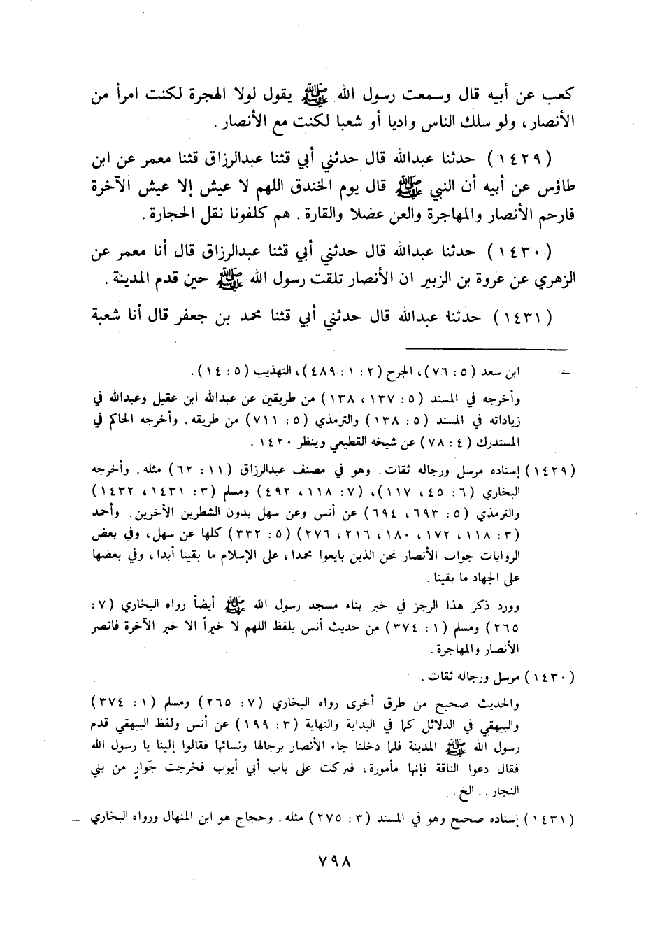 1430 - حَدَّثَنَا عَبْدُ اللَّهِ قَالَ: حَدَّثَنِي أَبِي، قثنا عَبْدُ الرَّزَّاقِ قَالَ: أنا مَعْمَرٌ، عَنِ الزُّهْرِيِّ، عَنْ عُرْوَةَ بْنِ الزُّبَيْرِ، «§أَنَّ الْأَنْصَارَ تَلَقَّتْ رَسُولَ اللَّهِ صَلَّى اللهُ عَلَيْهِ وَسَلَّمَ حِينَ قَدِمَ الْمَدِينَةَ» .