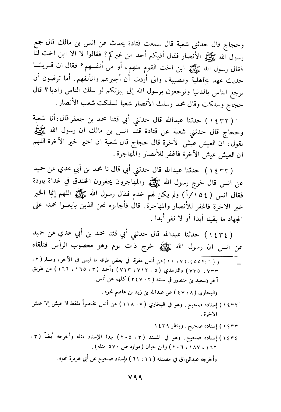 1432 - حَدَّثَنَا عَبْدُ اللَّهِ قَالَ: حَدَّثَنِي أَبِي، قثنا مُحَمَّدُ بْنُ جَعْفَرٍ قَالَ: أنا شُعْبَةُ، وَحَجَّاجٌ قَالَ: حَدَّثَنِي شُعْبَةُ، عَنْ قَتَادَةَ قَالَ: قثنا أَنَسُ بْنُ مَالِكٍ، أَنَّ رَسُولَ اللَّهِ صَلَّى اللهُ عَلَيْهِ وَسَلَّمَ يَقُولُ: إِنَّ الْعَيْشَ عَيْشُ الْآخِرَةِ قَالَ: حَجَّاجٌ قَالَ: شُعْبَةُ: إِنَّ الْخَيْرَ خَيْرُ الْآخِرَةِ، «§اللَّهُمَّ إِنَّ الْعَيْشَ عَيْشُ الْآخِرَةِ، فَاغْفِرْ لِلْأَنْصَارِ وَالْمُهَاجِرَةِ» .