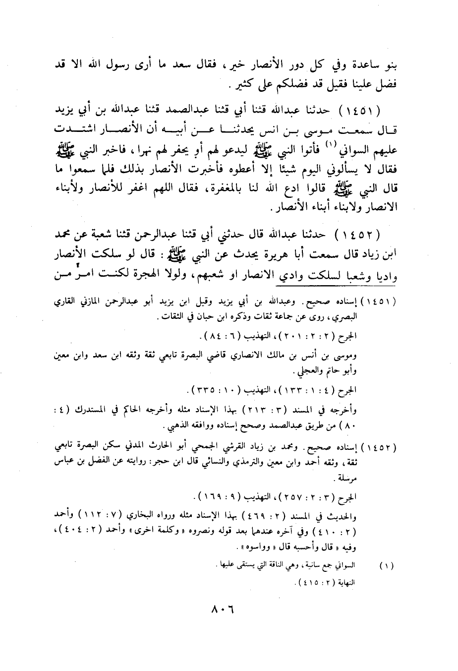 1451 - حَدَّثَنَا عَبْدُ اللَّهِ، قثنا أَبِي، قثنا عَبْدُ الصَّمَدِ قثنا عَبْدُ اللَّهِ بْنُ أَبِي يَزِيدَ قَالَ: سَمِعْتُ مُوسَى بْنَ أَنَسٍ، يُحَدِّثُنَا عَنْ أَبِيهِ، أَنَّ الْأَنْصَارَ اشْتَدَّتْ عَلَيْهِمُ السَّوَانِي فَأَتَوَا النَّبِيَّ صَلَّى اللهُ عَلَيْهِ وَسَلَّمَ لِيَدْعُوَ لَهُمْ، أَوْ يَحْفِرَ لَهُمْ نَهْرًا، فَأُخْبِرَ النَّبِيُّ صَلَّى اللهُ عَلَيْهِ وَسَلَّمَ فَقَالَ: «لَا يَسْأَلُونِي الْيَوْمَ شَيْئًا إِلَّا أُعْطُوهُ» ، فَأُخْبِرَتِ الْأَنْصَارُ بِذَلِكَ، فَلَمَّا سَمِعُوا مَا قَالَ النَّبِيُّ صَلَّى اللهُ عَلَيْهِ وَسَلَّمَ، قَالُوا: ادْعُ اللَّهَ لَنَا بِالْمَغْفِرَةِ، فَقَالَ: «§اللَّهُمَّ اغْفِرْ لِلْأَنْصَارِ وَلِأَبْنَاءِ الْأَنْصَارِ وَلِأَبْنَاءِ أَبْنَاءِ الْأَنْصَارِ» .