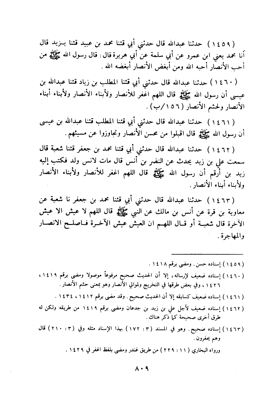 1459 - حَدَّثَنَا عَبْدُ اللَّهِ قَالَ: حَدَّثَنِي أَبِي، قثنا مُحَمَّدُ بْنُ عُبَيْدٍ، قثنا يَزِيدُ قَالَ: أنا مُحَمَّدٌ، يَعْنِي: ابْنَ عَمْرٍو، عَنْ أَبِي سَلَمَةَ، عَنْ أَبِي هُرَيْرَةَ قَالَ: قَالَ رَسُولُ اللَّهِ صَلَّى اللهُ عَلَيْهِ وَسَلَّمَ: «§مَنْ أَحَبَّ الْأَنْصَارَ أَحَبَّهُ اللَّهُ، وَمَنْ أَبْغَضَ الْأَنْصَارَ أَبْغَضَهُ اللَّهُ» .