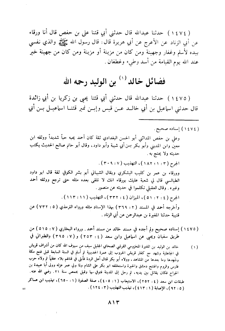 1475 - حَدَّثَنَا عَبْدُ اللَّهِ قَالَ: حَدَّثَنِي أَبِي، قثنا يَحْيَى بْنُ زَكَرِيَّا بْنِ أَبِي زَائِدَةَ قَالَ: حَدَّثَنِي إِسْمَاعِيلُ بْنُ أَبِي خَالِدٍ، عَنْ قَيْسٍ، وَابْنِ نُمَيْرٍ قثنا إِسْمَاعِيلُ بْنُ أَبِي خَالِدٍ، عَنْ قَيْسٍ قَالَ: سَمِعْتُ خَالِدَ بْنَ الْوَلِيدِ، يُحَدِّثُ الْقَوْمَ بِالْحِيرَةِ قَالَ: «§لَقَدْ رَأَيْتُنِي يَوْمَ مُؤْتَةَ انْدَقَّ بِيَدِي تِسْعَةُ أَسْيَافٍ، وَصَبَرَتْ بِيَدِي صَفِيحَةٌ لِي يَمَانِيَةٌ» .