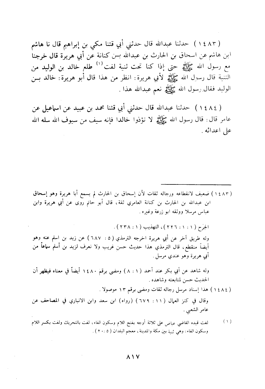 1483 - حَدَّثَنَا عَبْدُ اللَّهِ قَالَ: حَدَّثَنِي أَبِي، قثنا مَكِّيُّ بْنُ إِبْرَاهِيمَ قَالَ: نا هَاشِمُ بْنُ هَاشِمٍ، عَنْ إِسْحَاقَ بْنِ الْحَارِثِ بْنِ عَبْدِ اللَّهِ بْنِ كِنَانَةَ، عَنْ أَبِي هُرَيْرَةَ قَالَ: خَرَجْنَا مَعَ رَسُولِ اللَّهِ صَلَّى اللهُ عَلَيْهِ وَسَلَّمَ حَتَّى إِذَا كُنَّا تَحْتَ ثَنِيَّةِ لِفْتٍ طَلَعَ خَالِدُ بْنُ الْوَلِيدِ مِنَ الثَّنِيَّةِ قَالَ رَسُولُ اللَّهِ صَلَّى اللهُ عَلَيْهِ وَسَلَّمَ: لِأَبِي هُرَيْرَةَ «انْظُرْ مَنْ هَذَا؟» قَالَ أَبُو هُرَيْرَةَ: خَالِدُ بْنُ الْوَلِيدِ فَقَالَ رَسُولُ اللَّهِ صَلَّى اللهُ عَلَيْهِ وَسَلَّمَ: «§نِعْمَ عَبْدُ اللَّهِ هَذَا» .