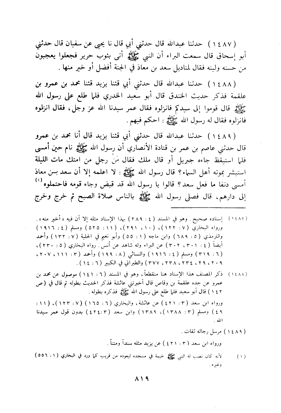 1487 - حَدَّثَنَا عَبْدُ اللَّهِ قَالَ: حَدَّثَنِي أَبِي، نا يَحْيَى، عَنْ سُفْيَانَ قَالَ: حَدَّثَنِي أَبُو إِسْحَاقَ قَالَ: سَمِعْتُ الْبَرَاءَ أَنَّ النَّبِيَّ صَلَّى اللهُ عَلَيْهِ وَسَلَّمَ أُتِيَ بِثَوْبِ حَرِيرٍ، فَجَعَلُوا يَعْجَبُونَ مِنْ حُسْنِهِ وَلِينِهِ، فَقَالَ: «§لَمَنَادِيلُ سَعْدِ بْنِ مُعَاذٍ فِي الْجَنَّةِ، أَفْضَلُ أَوْ خَيْرٌ مِنْهَا» .