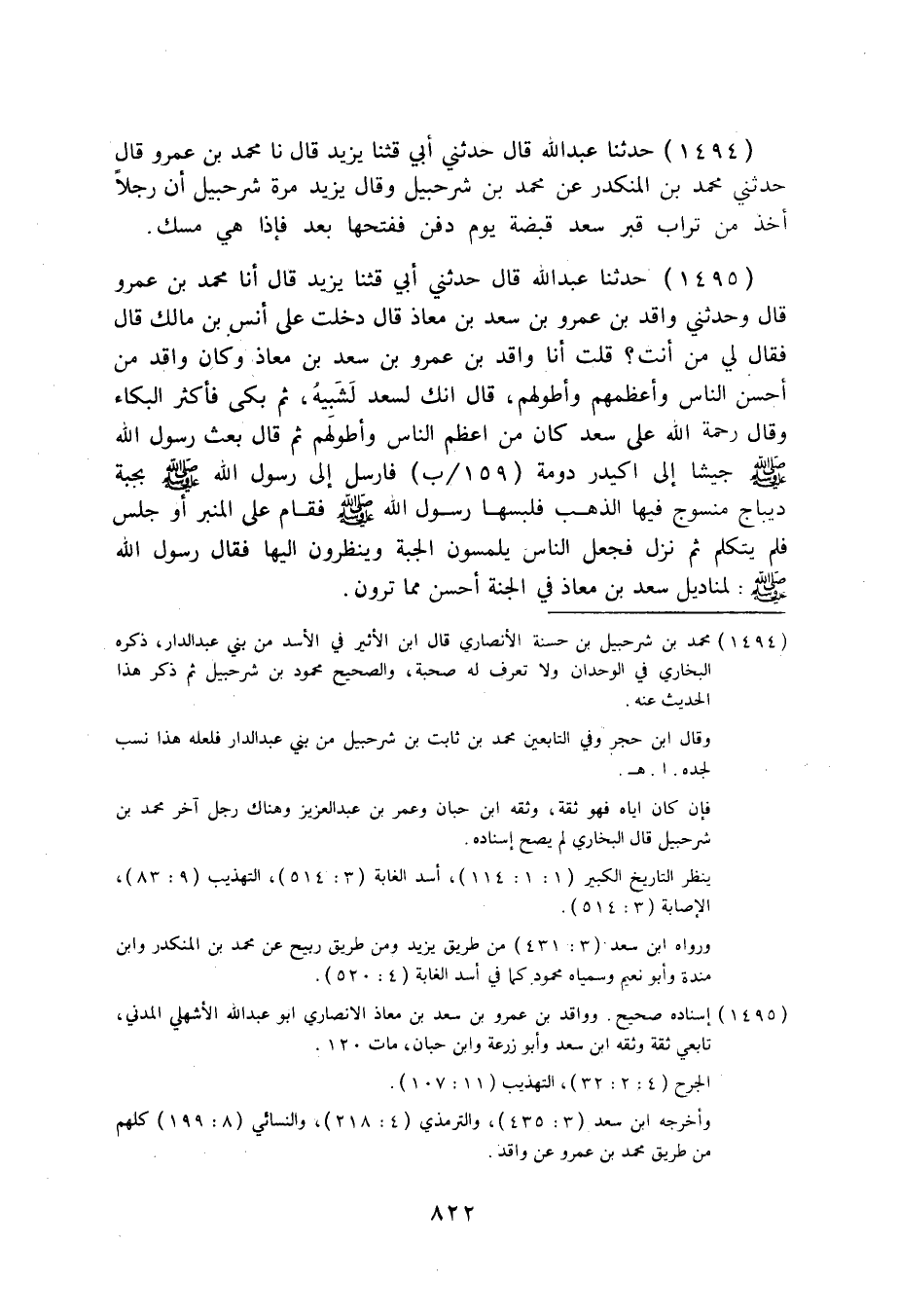1495 - حَدَّثَنَا عَبْدُ اللَّهِ قَالَ: حَدَّثَنِي أَبِي، قثنا يَزِيدُ قَالَ: نا مُحَمَّدُ بْنُ عَمْرٍو قَالَ: وَحَدَّثَنِي وَاقِدُ بْنُ عَمْرِو بْنِ سَعْدِ بْنِ مُعَاذٍ قَالَ: دَخَلْتُ عَلَى أَنَسِ بْنِ مَالِكٍ قَالَ: فَقَالَ لِي: مَنْ أَنْتَ؟، قُلْتُ: أَنَا وَاقِدُ بْنُ عَمْرِو بْنِ سَعْدِ بْنِ مُعَاذٍ وَكَانَ وَاقِدٌ مِنْ أَحْسَنِ النَّاسِ وَأَعْظَمِهِمْ وَأَطْوَلِهِمْ قَالَ: إِنَّكَ لِسَعْدٍ لَشَبِيهٌ، ثُمَّ بَكَى فَأَكْثَرَ الْبُكَاءَ وَقَالَ: رَحْمَةُ اللَّهِ عَلَى سَعْدٍ كَانَ مِنْ أَعْظَمِ النَّاسِ وَأَطْوَلِهِمْ، ثُمَّ قَالَ: بَعَثَ رَسُولُ اللَّهِ صَلَّى اللهُ عَلَيْهِ وَسَلَّمَ جَيْشًا إِلَى أُكَيْدِرَ دُومَةٍ فَأَرْسَلَ إِلَى رَسُولِ اللَّهِ صَلَّى اللهُ عَلَيْهِ وَسَلَّمَ بِجُبَّةِ دِيبَاجٍ مَنْسُوجٌ فِيهَا الذَّهَبُ فَلَبِسَهَا رَسُولُ اللَّهِ صَلَّى اللهُ عَلَيْهِ وَسَلَّمَ فَقَامَ عَلَى الْمِنْبَرِ أَوْ جَلَسَ فَلَمْ يَتَكَلَّمْ ثُمَّ نَزَلَ فَجَعَلَ يَلْمِسُونَ الْجُبَّةَ وَيَنْظُرُونَ إِلَيْهَا، فَقَالَ رَسُولُ اللَّهِ صَلَّى اللهُ عَلَيْهِ وَسَلَّمَ: «§لَمَنَادِيلُ سَعْدِ بْنِ مُعَاذٍ فِي الْجَنَّةِ أَحْسَنُ مِمَّا تَرَوْنَ» .