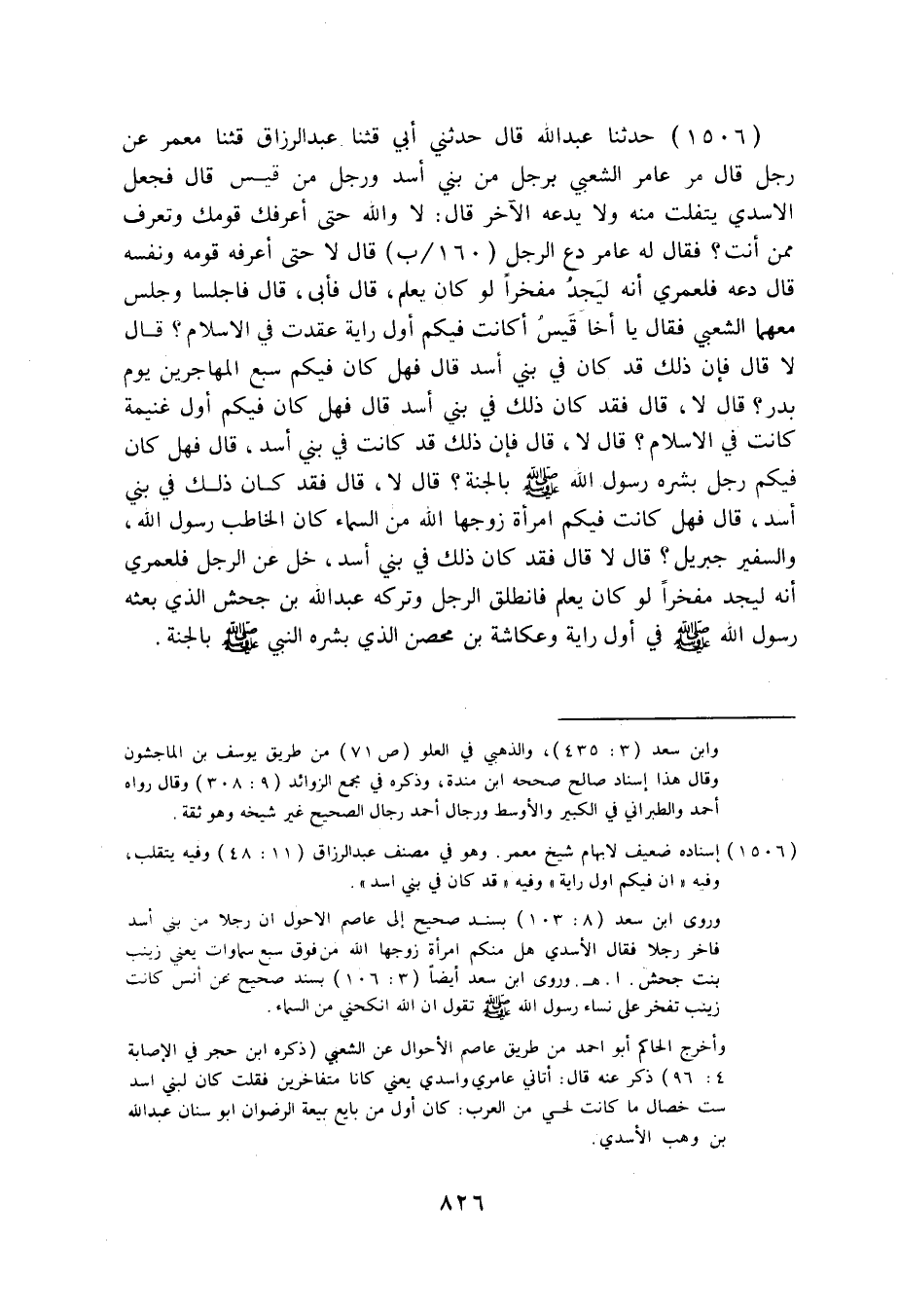 1506 - حَدَّثَنَا عَبْدُ اللَّهِ قَالَ: حَدَّثَنِي أَبِي، قثنا عَبْدُ الرَّزَّاقِ قثنا مَعْمَرٌ، عَنْ رَجُلٍ قَالَ: مَرَّ عَامِرٌ الشَّعْبِيُّ بِرَجُلٍ مِنْ بَنِي أَسَدٍ، وَرَجُلٍ مِنْ قَيْسٍ قَالَ: فَجَعَلَ الْأَسَدِيُّ يَتَفَلَّتُ مِنْهُ، وَلَا يَدَعُهُ الْآخَرُ قَالَ: لَا وَاللَّهِ حَتَّى أُعَرِّفَكَ قَوْمَكَ وَتَعْرِفُ مِمَّنْ أَنْتَ؟ فَقَالَ لَهُ عَامِرٌ: دَعِ الرَّجُلَ، قَالَ: لَا حَتَّى أَعْرِفَهُ قَوْمَهُ وَنَفْسَهُ قَالَ: دَعْهُ فَلَعَمْرِي إِنَّهُ لَيَجِدُ مَفْخَرًا لَوْ كَانَ يَعْلَمُ قَالَ: فَأَبَى قَالَ: فَاجْلِسَا وَجَلَسَ مَعَهُمَا الشَّعْبِيُّ فَقَالَ: يَا أَخَا قَيْسٍ «§أَكَانَتْ فِيكُمْ أَوَّلُ رَايَةٍ عُقِدَتْ فِي الْإِسْلَامِ؟» قَالَ: لَا، قَالَ: فَإِنَّ ذَلِكَ قَدْ كَانَ فِي بَنِي أَسَدٍ قَالَ: «فَهَلْ كَانَ فِيكُمْ سُبُعُ الْمُهَاجِرِينَ يَوْمَ بَدْرٍ؟» قَالَ: لَا، قَالَ: فَقَدْ كَانَ ذَلِكَ فِي بَنِي أَسَدٍ قَالَ: «فَهَلْ كَانَ فِيكُمْ أَوَّلُ غَنِيمَةٍ كَانَتْ فِي الْإِسْلَامِ؟» قَالَ: لَا، قَالَ: فَإِنَّ ذَلِكَ قَدْ كَانَتْ فِي بَنِي أَسَدٍ قَالَ: «فَهَلْ كَانَ فِيكُمْ رَجُلٌ بَشَّرَهُ رَسُولُ اللَّهِ صَلَّى اللهُ عَلَيْهِ وَسَلَّمَ بِالْجَنَّةِ؟» قَالَ: لَا، قَالَ: فَقَدْ كَانَ ذَلِكَ فِي بَنِي أَسَدٍ قَالَ: «فَهَلْ كَانَتْ فِيكُمُ امْرَأَةٌ زَوَّجَهَا اللَّهُ مِنَ السَّمَاءِ، كَانَ الْخَاطِبُ رَسُولُ اللَّهِ، وَالسَّفِيرُ جِبْرِيلُ؟» قَالَ: لَا، قَالَ: فَقَدْ كَانَ ذَلِكَ فِي بَنِي أَسَدٍ، خَلِّ عَنِ الرَّجُلِ، فَلَعَمْرِي أَنَّهُ لَيَجِدُ مَفْخَرًا لَوْ كَانَ يَعْلَمُ، فَانْطَلَقَ الرَّجُلُ وَتَرَكَهُ، «عَبْدُ اللَّهِ بْنُ جَحْشٍ الَّذِي بَعَثَهُ رَسُولُ اللَّهِ صَلَّى اللهُ عَلَيْهِ وَسَلَّمَ فِي أَوَّلِ رَايَةٍ، وَعُكَاشَةُ بْنُ مِحْصَنٍ الَّذِي بَشَرَهُ النَّبِيُّ صَلَّى اللهُ عَلَيْهِ وَسَلَّمَ بِالْجَنَّةِ» .