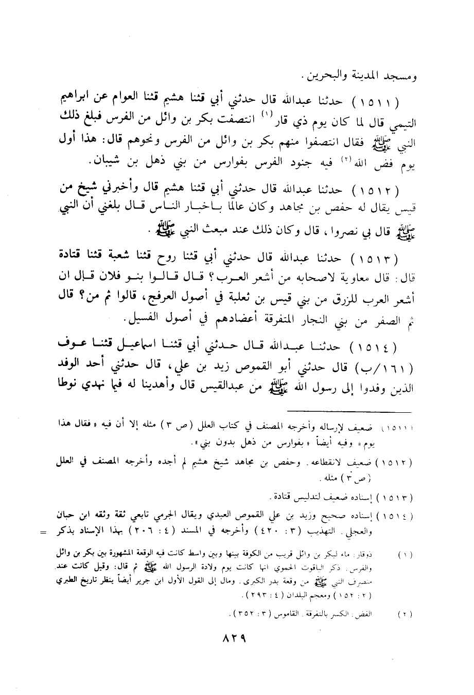 1511 - حَدَّثَنَا عَبْدُ اللَّهِ قَالَ: حَدَّثَنِي أَبِي، قثنا هُشَيْمٌ قثنا الْعَوَّامُ، عَنْ إِبْرَاهِيمَ التَّيْمِيِّ، قَالَ: لَمَّا كَانَ يَوْمُ ذِي قَارٍ انْتَصَفَتْ بَكْرُ بْنُ وَائِلٍ مِنَ الْفُرْسِ، فَبَلَغَ ذَلِكَ النَّبِيَّ صَلَّى اللهُ عَلَيْهِ وَسَلَّمَ فَقَالَ: " §انْتَصَفُوا مِنْهُمْ بَكْرُ بْنُ وَائِلٍ، مِنَ الْفُرْسِ وَنَحْوِهِمْ قَالَ: هَذَا أَوَّلُ يَوْمٍ فَضَّ اللَّهُ فِيهِ جُنُودِ الْفُرْسِ بِفَوَارِسَ مِنْ بَنِي ذُهْلِ بْنِ شَيْبَانَ ".