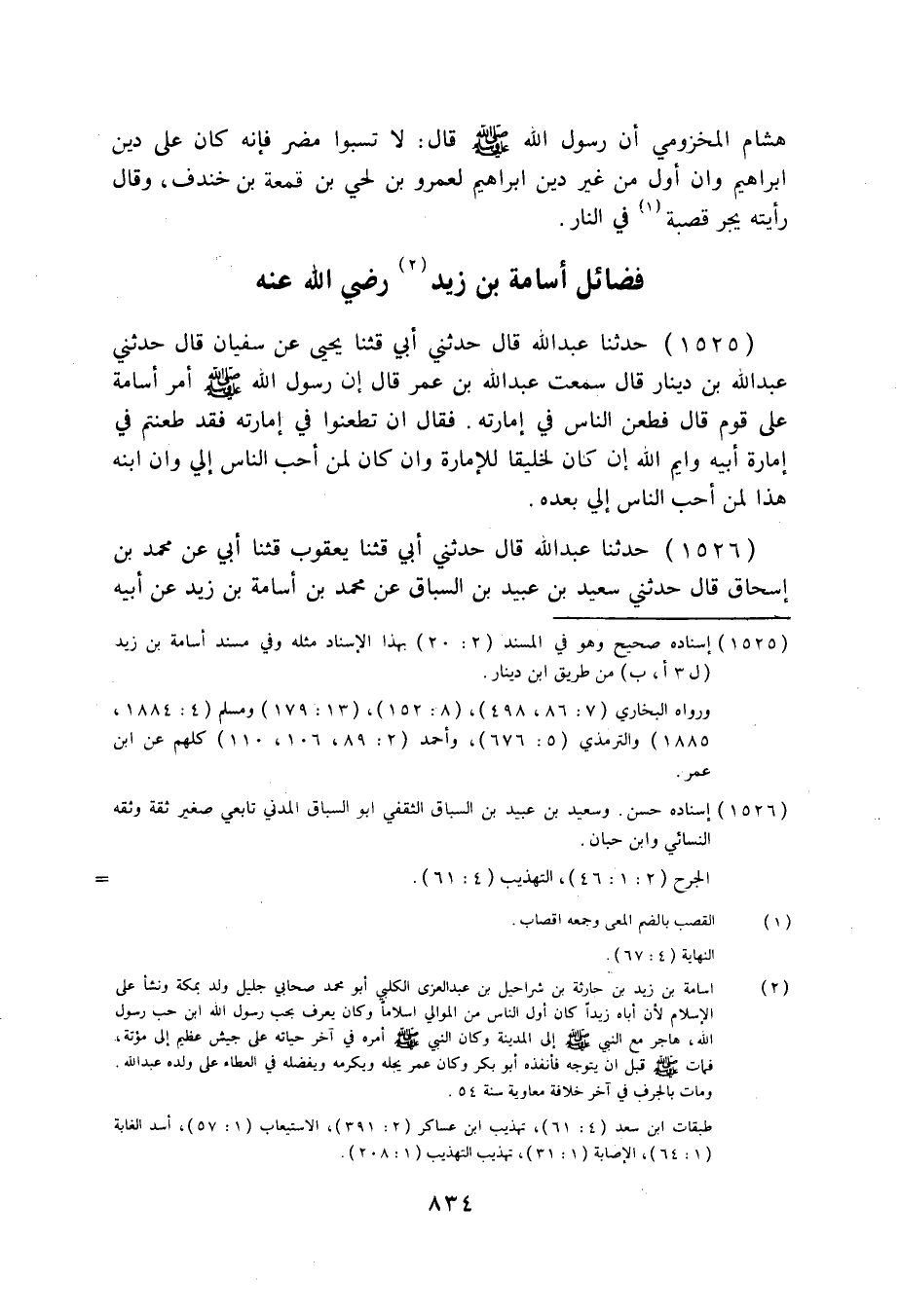 1525 - حَدَّثَنَا عَبْدُ اللَّهِ قَالَ: حَدَّثَنِي أَبِي، قثنا يَحْيَى، عَنْ سُفْيَانَ قَالَ: حَدَّثَنِي عَبْدُ اللَّهِ بْنُ دِينَارٍ قَالَ: سَمِعْتُ عَبْدَ اللَّهِ بْنُ عُمَرَ قَالَ: إِنَّ رَسُولَ اللَّهِ صَلَّى اللهُ عَلَيْهِ وَسَلَّمَ أَمَرَ أُسَامَةَ عَلَى قَوْمٍ قَالَ: فَطَعَنَ النَّاسُ فِي إِمَارَتِهِ، فَقَالَ: «§إِنْ تَطْعَنُوا فِي إِمَارَتِهِ، فَقَدْ طَعَنْتُمْ فِي إِمَارَةِ أَبِيهِ، وَايْمُ اللَّهِ إِنْ كَانَ لَخَلِيقًا لِلْإِمَارَةِ وَإِنْ كَانَ لِمَنْ أَحَبِّ النَّاسِ إِلَيَّ، وَإِنَّ ابْنَهُ هَذَا لِمَنْ أَحَبِّ النَّاسِ إِلَيَّ بَعْدَهُ» .