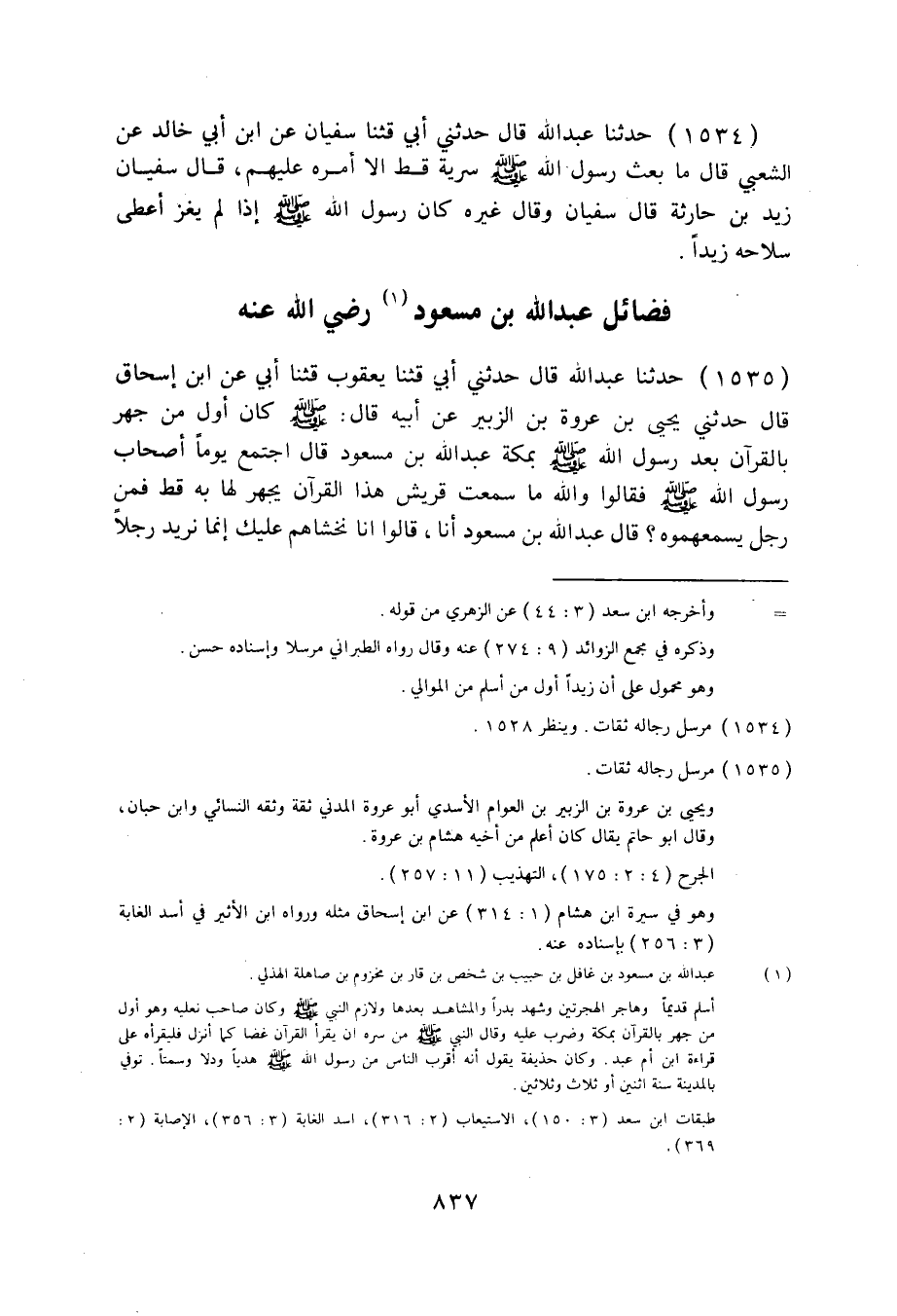 1535 - حَدَّثَنَا عَبْدُ اللَّهِ قَالَ: حَدَّثَنِي أَبِي، قثنا يَعْقُوبُ قثنا أَبِي، عَنِ ابْنِ إِسْحَاقَ قَالَ: حَدَّثَنِي يَحْيَى بْنُ عُرْوَةَ بْنِ الزُّبَيْرِ، عَنْ أَبِيهِ قَالَ: كَانَ §أَوَّلَ مَنْ جَهَرَ بِالْقُرْآنِ بَعْدَ رَسُولِ اللَّهِ صَلَّى اللهُ عَلَيْهِ وَسَلَّمَ بِمَكَّةَ عَبْدُ اللَّهِ بْنُ مَسْعُودٍ قَالَ: اجْتَمَعَ يَوْمًا أَصْحَابُ رَسُولِ اللَّهِ صَلَّى اللهُ عَلَيْهِ وَسَلَّمَ فَقَالُوا: وَاللَّهِ مَا سَمِعَتْ قُرَيْشٌ هَذَا الْقُرْآنَ يُجْهَرُ لَهَا بِهِ قَطُّ، فَمَنْ رَجُلٌ يُسْمِعُهُمُوهُ؟ قَالَ عَبْدُ اللَّهِ بْنُ مَسْعُودٍ: «أَنَا» ، قَالُوا: إِنَّا نِخْشَاهُمْ عَلَيْكَ، إِنَّمَا نُرِيدُ رَجُلًا لَهُ عَشِيرَةٌ يَمْنَعُونَهُ مِنَ الْقَوْمِ إِنْ أَرَادُوهُ، قَالَ: «دَعُونِي فَإِنَّ اللَّهَ عَزَّ وَجَلَّ سَيَمْنَعُنِي» قَالَ: فَغَدَا ابْنُ مَسْعُودٍ حَتَّى أَتَى الْمَقَامَ فِي الضُّحَى، وَقُرَيْشٌ فِي أَنْدِيَتِهَا فَقَامَ عِنْدَ الْمَقَامِ، ثُمَّ قَالَ: " بِسْمِ اللَّهِ الرَّحْمَنِ الرَّحِيمِ رَافِعًا صَوْتَهُ {الرَّحْمَنُ عَلَّمَ الْقُرْآنَ} [الرحمن: 2] قَالَ: ثُمَّ اسْتَقْبَلَهَا يَقْرَأُ فِيهَا " قَالَ: وَتَأَمَّلُوا فَجَعَلُوا يَقُولُونَ: مَا يَقُولُ ابْنُ أُمِّ عَبْدٍ؟ قَالَ: ثُمَّ قَالُوا: إِنَّهُ لَيَتْلُو بَعْضَ مَا جَاءَ بِهِ مُحَمَّدٌ، فَقَامُوا إِلَيْهِ فَجَعَلُوا يَضْرِبُونَ فِي وَجْهِهِ، وَجَعَلَ يَقْرَأُ حَتَّى بَلَغَ مِنْهَا مَا شَاءَ اللَّهُ أَنْ يَبْلُغَ، ثُمَّ انْصَرَفَ إِلَى أَصْحَابِهِ وَقَدْ أَثَّرُوا فِي وَجْهِهِ، فَقَالُوا: هَذَا الَّذِي خَشِينَا عَلَيْكَ قَالَ: «مَا كَانَ أَعْدَاءُ اللَّهِ أَهْوَنَ عَلَيَّ مِنْهُمُ الْآنَ، وَلَئِنْ شِئْتُمْ لَأُغَادِيَنَّهُمْ بِمِثْلِهَا» ، قَالُوا: حَسْبُكَ فَقَدْ أَسْمَعْتَهُمْ مَا يَكْرَهُونَ.
