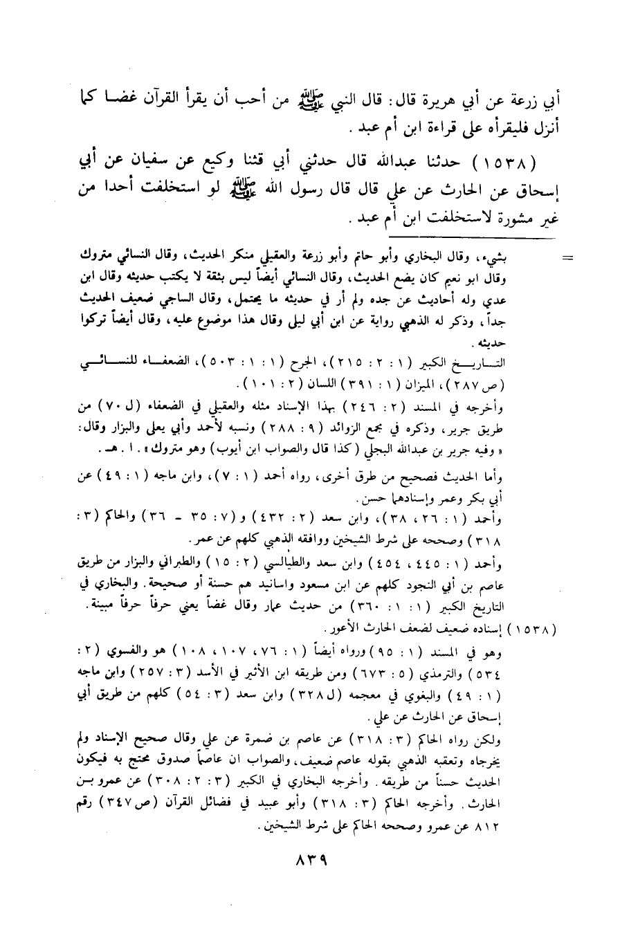 1538 - حَدَّثَنَا عَبْدُ اللَّهِ قَالَ: حَدَّثَنِي أَبِي، قثنا وَكِيعٌ، عَنْ سُفْيَانَ، عَنْ أَبِي إِسْحَاقَ، عَنِ الْحَارِثِ، عَنْ عَلِيٍّ قَالَ: قَالَ رَسُولُ اللَّهِ صَلَّى اللهُ عَلَيْهِ وَسَلَّمَ: «§لَوِ اسْتَخْلَفْتُ أَحَدًا مِنْ غَيْرِ مَشُورَةٍ، لَاسْتَخْلَفْتُ ابْنَ أُمِّ عَبْدٍ» .