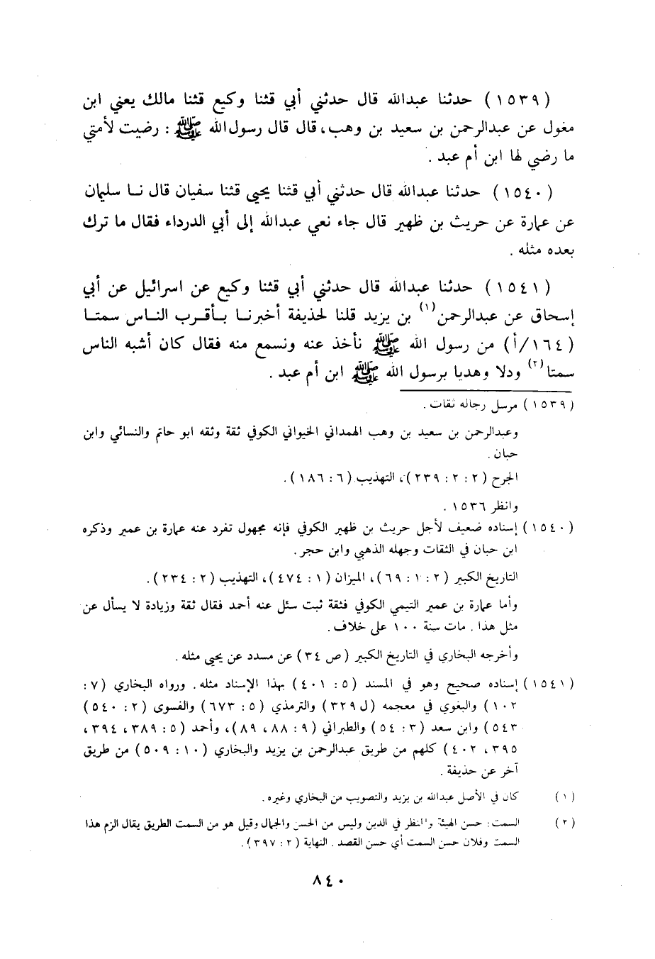 1541 - حَدَّثَنَا عَبْدُ اللَّهِ قَالَ: حَدَّثَنِي أَبِي، قثنا وَكِيعٌ، عَنْ إِسْرَائِيلَ، عَنْ أَبِي إِسْحَاقَ، عَنْ عَبْدِ الرَّحْمَنِ بْنِ يَزِيدَ، قُلْنَا لِحُذَيْفَةَ " §أَخْبِرْنَا بِأَقْرَبِ النَّاسِ سَمْتًا مِنْ رَسُولِ اللَّهِ صَلَّى اللهُ عَلَيْهِ وَسَلَّمَ نَأْخُذُ عَنْهُ، وَنَسْمَعُ مِنْهُ، فَقَالَ: كَانَ أَشْبَهُ النَّاسِ سَمْتًا وَدَلًّا وَهَدْيًا بِرَسُولِ اللَّهِ صَلَّى اللهُ عَلَيْهِ وَسَلَّمَ ابْنَ أُمِّ عَبْدٍ ".