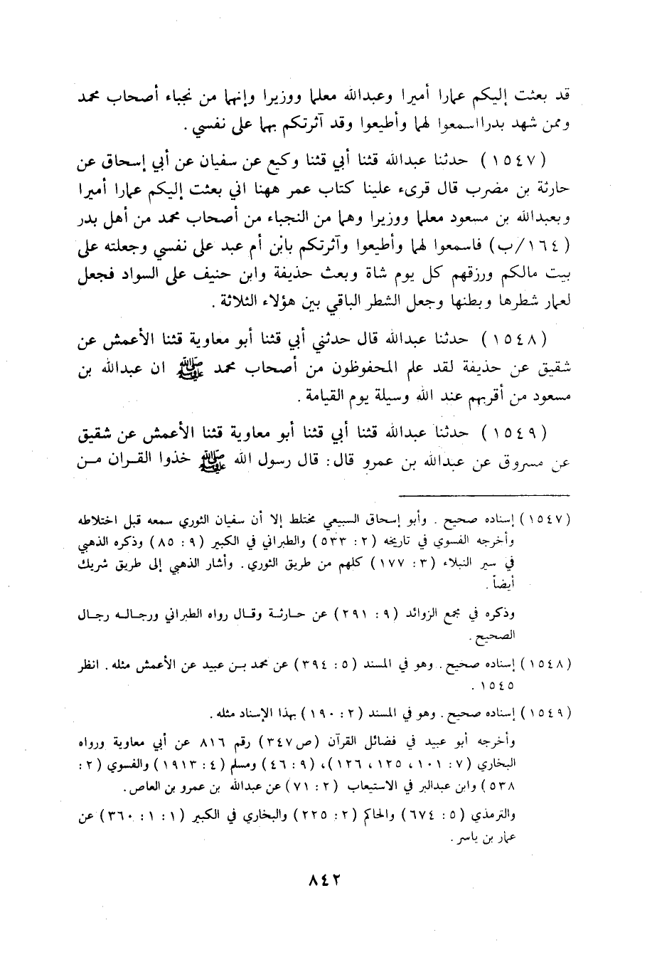 1547 - حَدَّثَنَا عَبْدُ اللَّهِ، قثنا أَبِي، قثنا وَكِيعٌ، عَنْ سُفْيَانَ، عَنْ أَبِي إِسْحَاقَ، عَنْ حَارِثَةَ بْنِ مُضَرِّبٍ قَالَ: قُرِئَ عَلَيْنَا كِتَابُ عُمَرَ هَهُنَا: «§إِنِّي بُعِثْتُ إِلَيْكُمْ عَمَّارًا أَمِيرًا، وَبِعَبْدِ اللَّهِ بْنِ مَسْعُودٍ مُعَلِّمًا وَوَزِيرًا، وَهُمَا مِنَ النُّجَبَاءِ مِنْ أَصْحَابِ مُحَمَّدٍ مِنْ أَهْلِ بَدْرٍ فَاسْمَعُوا لَهُمَا وَأَطِيعُوا، وَآثَرْتُكُمْ بِابْنِ أُمِّ عَبْدٍ عَلَى نَفْسِي، وَجَعَلْتُهُ عَلَى بَيْتِ مَالِكُمْ، وَرِزْقُهُمْ كُلَّ يَوْمٍ شَاةٌ، وَبَعَثَ حُذَيْفَةَ، وَابْنَ حُنَيْفٍ عَلَى السَّوَادِ، فَجَعَلَ لِعَمَّارٍ شَطْرَهَا وَبَطْنَهَا وَجَعَلَ الشَّطْرَ الْبَاقِي بَيْنَ هَؤُلَاءِ الثَّلَاثَةِ» .