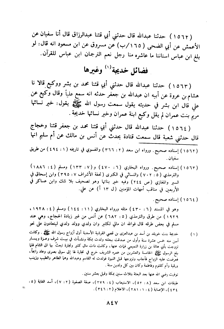 1563 - حَدَّثَنَا عَبْدُ اللَّهِ قَالَ: حَدَّثَنِي أَبِي، قثنا مُحَمَّدُ بْنُ بِشْرٍ، وَوَكِيعٌ قَالَا: نا هِشَامُ بْنُ عُرْوَةَ، عَنْ أَبِيهِ، أَنَّ عَبْدَ اللَّهِ بْنَ جَعْفَرٍ، حَدَّثَهُ أَنَّهُ سَمِعَ عَلِيًّا وَقَالَ وَكِيعٌ عَنْ عَلِيٍّ قَالَ ابْنُ بِشْرٍ فِي حَدِيثِهِ يَقُولُ: سَمِعْتُ رَسُولَ اللَّهِ صَلَّى اللهُ عَلَيْهِ وَسَلَّمَ يَقُولُ: «§خَيْرُ نِسَائِهَا مَرْيَمُ بِنْتُ عِمْرَانَ - لَمْ يَقُلْ وَكِيعٌ ابْنَةُ عِمْرَانَ - وَخَيْرُ نِسَائِهَا خَدِيجَةُ» .