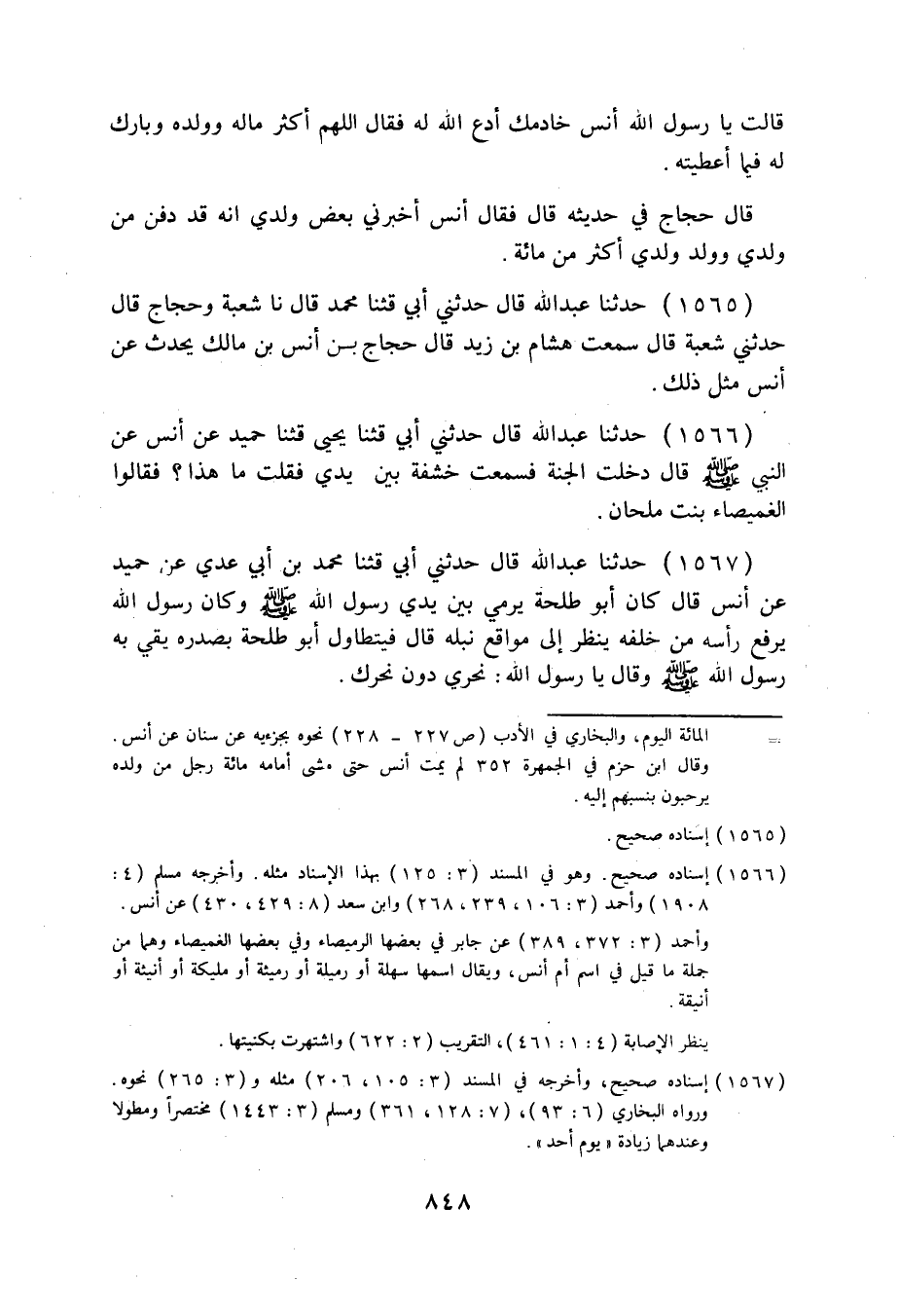 1566 - حَدَّثَنَا عَبْدُ اللَّهِ قَالَ: حَدَّثَنِي أَبِي، قثنا يَحْيَى قثنا حُمَيْدٌ، عَنْ أَنَسٍ، عَنِ النَّبِيِّ صَلَّى اللهُ عَلَيْهِ وَسَلَّمَ قَالَ: " §دَخَلْتُ الْجَنَّةَ فَسَمِعْتُ خَشْفَةً بَيْنَ يَدِي، فَقُلْتُ: مَا هَذَا؟ فَقَالُوا: الْغُمَيْصَاءُ بِنْتُ مِلْحَانَ ".