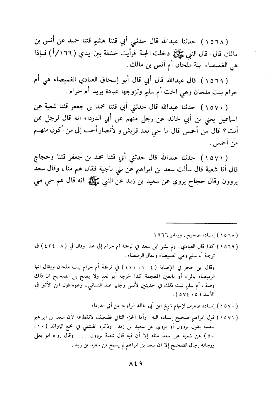 1568 - حَدَّثَنَا عَبْدُ اللَّهِ قَالَ: حَدَّثَنِي أَبِي، قثنا هُشَيْمٌ قثنا حُمَيْدٌ، عَنْ أَنَسِ بْنِ مَالِكٍ قَالَ: قَالَ النَّبِيُّ صَلَّى اللهُ عَلَيْهِ وَسَلَّمَ: «§دَخَلْتُ الْجَنَّةَ فَرَأَيْتُ خَشْفَةً بَيْنَ يَدَيْ فَإِذَا هِيَ الْغُمَيْصَاءُ ابْنَةُ مِلْحَانَ أُمُّ أَنَسِ بْنِ مَالِكٍ» .
