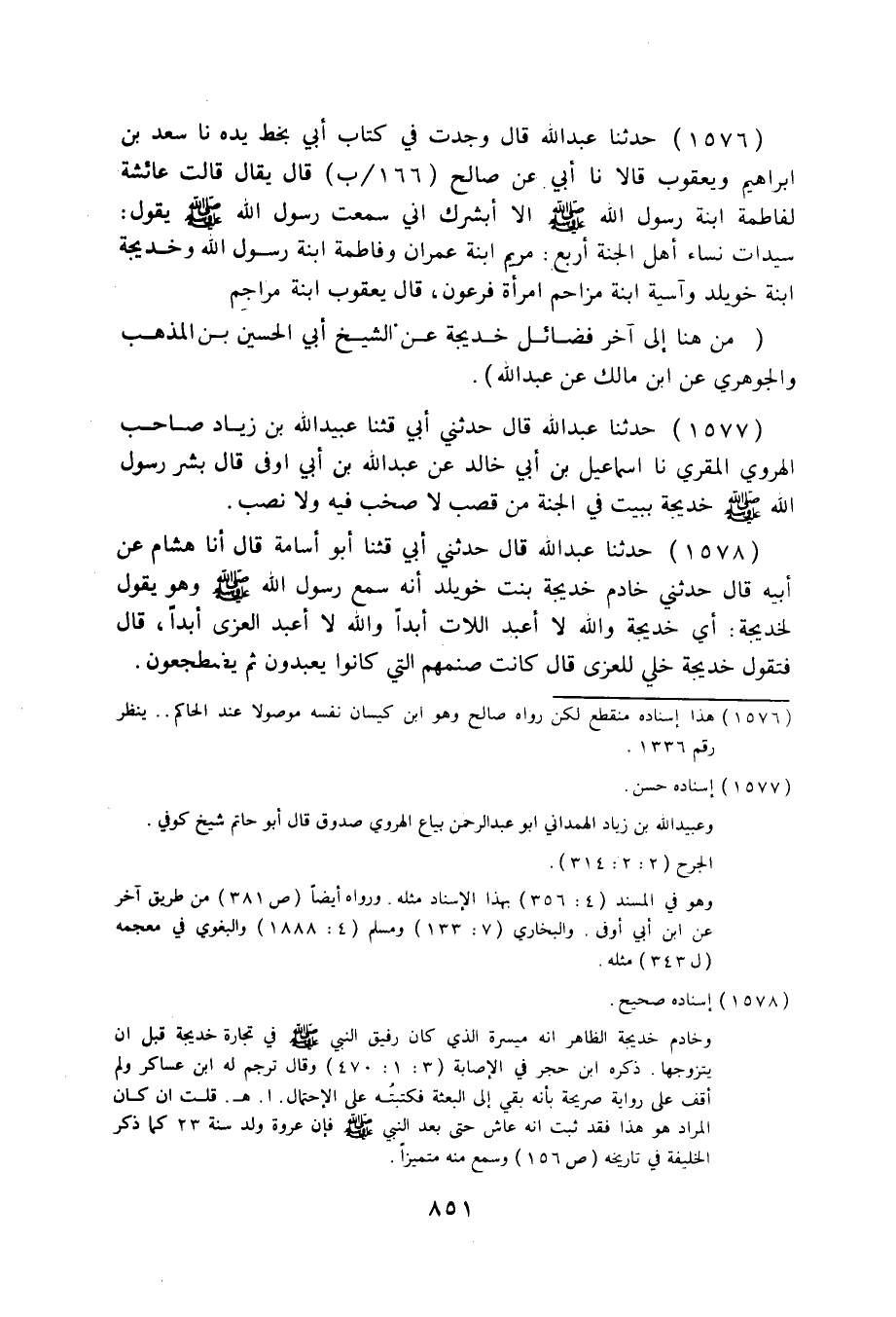 1576 - حَدَّثَنَا عَبْدُ اللَّهِ قَالَ: وَجَدْتُ فِي كِتَابِ أَبِي بِخَطِّ يَدِهِ، نا سَعْدُ بْنُ إِبْرَاهِيمَ، وَيَعْقُوبُ قَالَا: نا أَبِي، عَنْ صَالِحٍ قَالَ: يُقَالُ: قَالَتْ عَائِشَةُ: لِفَاطِمَةَ ابْنَةِ رَسُولِ اللَّهِ صَلَّى اللهُ عَلَيْهِ وَسَلَّمَ إِلَّا أُبَشِّرُكِ أَنِّي سَمِعْتُ رَسُولَ اللَّهِ صَلَّى اللهُ عَلَيْهِ وَسَلَّمَ يَقُولُ: " §سَيِّدَاتُ نِسَاءِ أَهْلِ الْجَنَّةِ أَرْبَعٌ: مَرْيَمُ ابْنَةُ عِمْرَانَ، وَفَاطِمَةُ ابْنَةُ رَسُولِ اللَّهِ، وَخَدِيجَةُ ابْنَةُ خُوَيْلِدٍ، وَآسِيَةُ ابْنَةُ مُزَاحِمٍ امْرَأَةُ فِرْعَوْنَ ". قَالَ يَعْقُوبُ: ابْنَةُ مُرَاجِمٍ مِنْ هُنَا إِلَى آخِرِ فَضَائِلِ خَدِيجَةَ، عَنِ الشَّيْخِ أَبِي الْحُسَيْنِ بْنِ الْمَذْهَبِ، وَالْجَوْهَرِيِّ، عَنِ ابْنِ مَالِكٍ، عَنْ عَبْدِ اللَّهِ