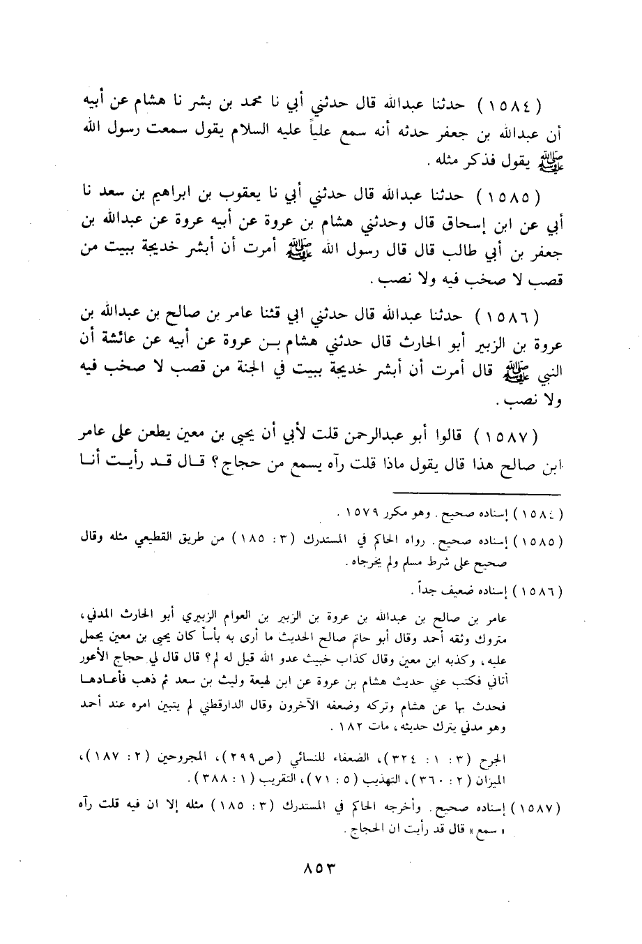 1586 - حَدَّثَنَا عَبْدُ اللَّهِ قَالَ: حَدَّثَنِي أَبِي، قثنا عَامِرُ بْنُ صَالِحِ بْنِ عَبْدِ اللَّهِ بْنِ عُرْوَةَ بْنِ الزُّبَيْرِ أَبُو الْحَارِثِ قَالَ: حَدَّثَنِي هِشَامُ بْنُ عُرْوَةَ، عَنْ أَبِيهِ، عَنْ عَائِشَةَ أَنَّ النَّبِيَّ صَلَّى اللهُ عَلَيْهِ وَسَلَّمَ قَالَ: «§أُمِرْتُ أَنْ أُبَشِّرَ خَدِيجَةَ بِبَيْتٍ فِي الْجَنَّةِ مِنْ قَصَبٍ، لَا صَخَبَ فِيهِ، وَلَا نَصَبَ» .
