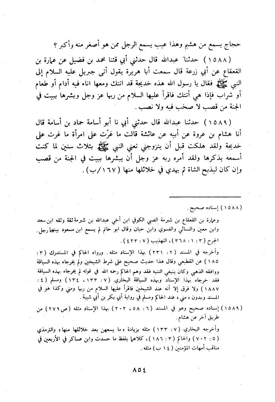 1588 - حَدَّثَنَا عَبْدُ اللَّهِ قَالَ: حَدَّثَنِي أَبِي، قثنا مُحَمَّدُ بْنُ فُضَيْلٍ، عَنْ عُمَارَةَ بْنِ الْقَعْقَاعِ، عَنْ أَبِي زُرْعَةَ قَالَ: سَمِعْتُ أَبَا هُرَيْرَةَ يَقُولُ: " أَتَى جِبْرِيلُ عَلَيْهِ السَّلَامُ إِلَى النَّبِيِّ صَلَّى اللهُ عَلَيْهِ وَسَلَّمَ فَقَالَ: يَا رَسُولَ اللَّهِ، هَذِهِ خَدِيجَةُ قَدْ أَتَتْكَ وَمَعَهَا إِنَاءٌ فِيهِ إِدَامٌ أَوْ طَعَامٌ أَوْ شَرَابٌ، فَإِذَا هِيَ أَتَتْكَ فَاقْرَأْ عَلَيْهَا السَّلَامَ مِنْ رَبِّهَا عَزَّ وَجَلَّ §وَبَشِّرْهَا بِبَيْتٍ فِي الْجَنَّةِ مِنْ قَصَبٍ، لَا صَخَبَ فِيهِ، وَلَا نَصَبَ.